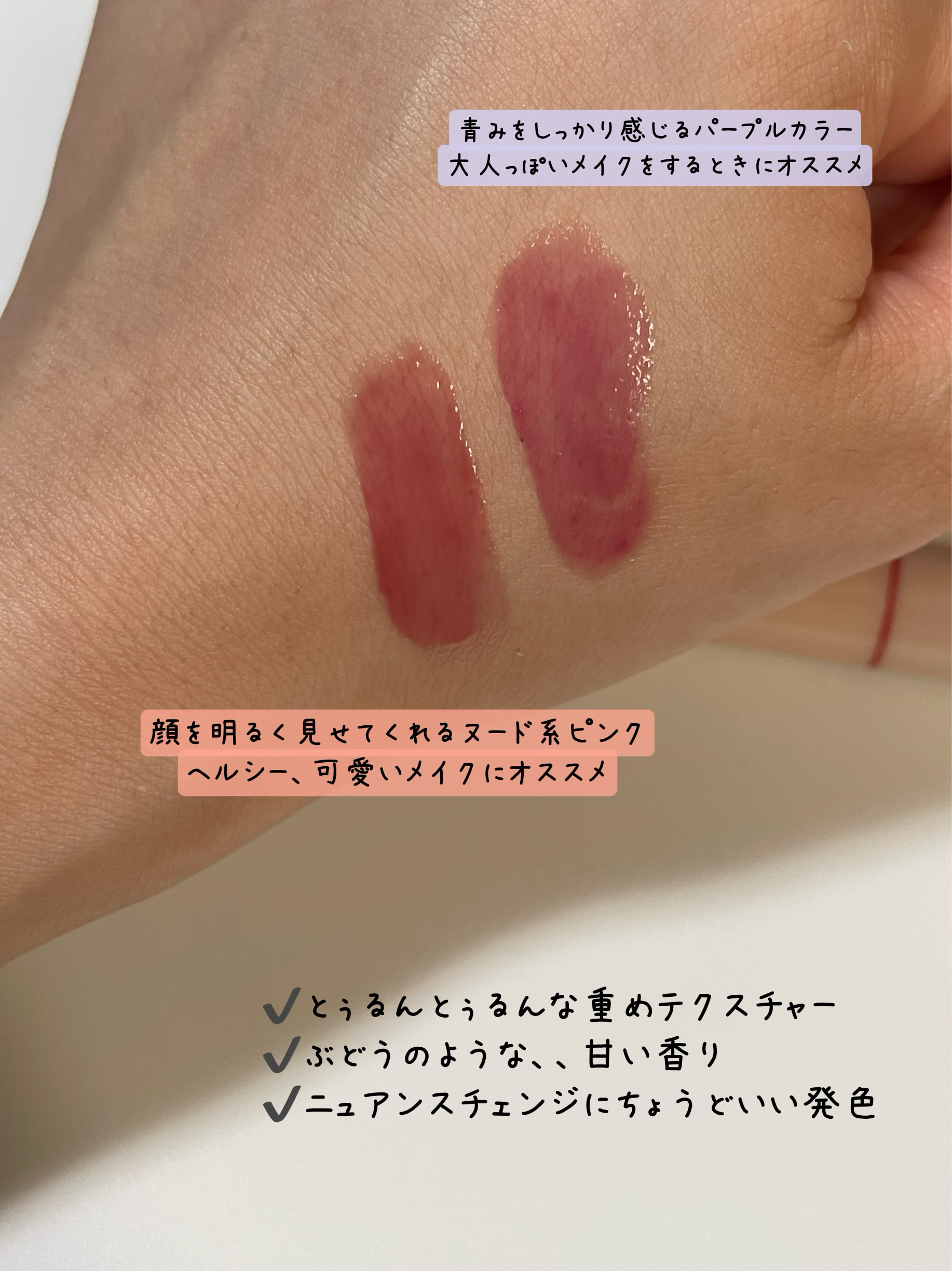 - <01 アプリコットティー> リンゴ酸ジイソステアリル、ダイマージリノール酸ダイマージリノレイルビス(ベヘニル/イソステアリル/フィトステリル)、ビスジグリセリルポリアシルアジペート-2、トリイソステアリン酸ポリグリセリル-2、水添ポリイソブテン、パラフィン、マイクロクリスタリンワックス、ウルシ果皮ロウ、ハチミツエキス、センチフォリアバラ花エキス、マンゴー果実エキス、カニナバラ果実エキス、アーモンド油、アルガニアスピノサ核油、アンズ核油、オリーブ果実油、シア脂、ツバキ種子油、ホホバ種子油、月見草油、BG、トリ(カプリル酸/カプリン酸)グリセリル、1,2-ヘキサンジオール、イソステアリン酸ソルビタン、酢酸トコフェロール、フェノキシエタノール、酸化鉄、酸化チタン、赤202、香料 <02 イチジクミルク> リンゴ酸ジイソステアリル、ダイマージリノール酸ダイマージリノレイルビス(ベヘニル/イソステアリル/フィトステリル)、ビスジグリセリルポリアシルアジペート-2、トリイソステアリン酸ポリグリセリル-2、水添ポリイソブテン、パラフィン、マイクロクリスタリンワックス、ウルシ果皮ロウ、ハチミツエキス、センチフォリアバラ花エキス、マンゴー果実エキス、カニナバラ果実エキス、アーモンド油、アルガニアスピノサ核油、シア脂、オリーブ果実油、アンズ核油、ツバキ種子油、ホホバ種子油、月見草油、BG、トリ(カプリル酸/カプリン酸)グリセリル、1,2-ヘキサンジオール、イソステアリン酸ソルビタン、酢酸トコフェロール、フェノキシエタノール、酸化鉄、酸化チタン、赤202、青1、香料 <03 ベリーヨーグルト> リンゴ酸ジイソステアリル、ダイマージリノール酸ダイマージリノレイルビス(ベヘニル/イソステアリル/フィトステリル)、ビスジグリセリルポリアシルアジペート-2、トリイソステアリン酸ポリグリセリル-2、水添ポリイソブテン、パラフィン、マイクロクリスタリンワックス、ウルシ果皮ロウ、ハチミツエキス、センチフォリアバラ花エキス、マンゴー果実エキス、カニナバラ果実エキス、アーモンド油、アルガニアスピノサ核油、シア脂、オリーブ果実油、アンズ核油、ツバキ種子油、ホホバ種子油、月見草油、BG、トリ(カプリル酸/カプリン酸)グリセリル、1,2-ヘキサンジオール、イソステアリン酸ソルビタン、酢酸トコフェロール、フェノキシエタノール、酸化鉄、酸化チタン、赤202、黄5、香料 <04 ザクロサワー> リンゴ酸ジイソステアリル、ダイマージリノール酸ダイマージリノレイルビス(ベヘニル/イソステアリル/フィトステリル)、ビスジグリセリルポリアシルアジペート-2、トリイソステアリン酸ポリグリセリル-2、水添ポリイソブテン、パラフィン、マイクロクリスタリンワックス、ウルシ果皮ロウ、ハチミツエキス、センチフォリアバラ花エキス、マンゴー果実エキス、カニナバラ果実エキス、アーモンド油、アルガニアスピノサ核油、シア脂、オリーブ果実油、アンズ核油、ツバキ種子油、ホホバ種子油、月見草油、BG、トリ(カプリル酸/カプリン酸)グリセリル、1,2-ヘキサンジオール、イソステアリン酸ソルビタン、酢酸トコフェロール、フェノキシエタノール、黄5、赤202、香料 <05 プラムワイン> リンゴ酸ジイソステアリル、ダイマージリノール酸ダイマージリノレイルビス(ベヘニル/イソステアリル/フィトステリル)、ビスジグリセリルポリアシルアジペート-2、トリイソステアリン酸ポリグリセリル-2、水添ポリイソブテン、パラフィン、マイクロクリスタリンワックス、ウルシ果皮ロウ、ハチミツエキス、センチフォリアバラ花エキス、マンゴー果実エキス、カニナバラ果実エキス、アーモンド油、アルガニアスピノサ核油、シア脂、オリーブ果実油、アンズ核油、ツバキ種子油、ホホバ種子油、月見草油、BG、トリ(カプリル酸/カプリン酸)グリセリル、1,2-ヘキサンジオール、イソステアリン酸ソルビタン、酢酸トコフェロール、フェノキシエタノール、酸化鉄、赤202、青1、香料 <06 チャイミルクティー> リンゴ酸ジイソステアリル、ダイマージリノール酸ダイマージリノレイルビス(ベヘニル/イソステアリル/フィトステリル)、ビスジグリセリルポリアシルアジペート-2、トリイソステアリン酸ポリグリセリル-2、水添ポリイソブテン、パラフィン、マイクロクリスタリンワックス、ハチミツエキス、センチフォリアバラ花エキス、マンゴー果実エキス、カニナバラ果実エキス、アーモンド油、アルガニアスピノサ核油、シア脂、オリーブ果実油、アンズ核油、ツバキ種子油、ホホバ種子油、月見草油、BG、トリ(カプリル酸/カプリン酸)グリセリル、水、1,2-ヘキサンジオール、イソステアリン酸ソルビタン、BHT、酢酸トコフェロール、フェノキシエタノール、酸化チタン、酸化鉄、香料 <21 ダーティチョコ> リンゴ酸ジイソステアリル、ダイマージリノール酸ダイマージリノレイルビス(ベヘニル/イソステアリル/フィトステリル)、ビスジグリセリルポリアシル