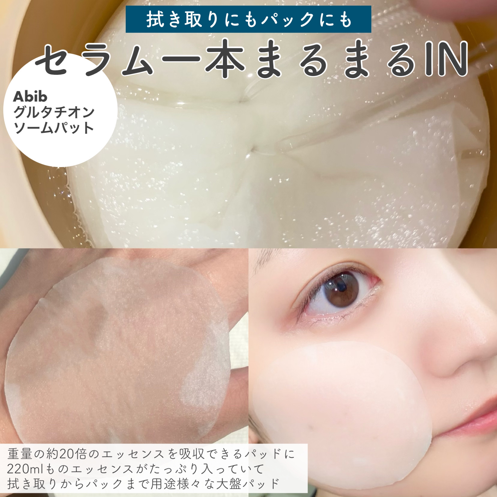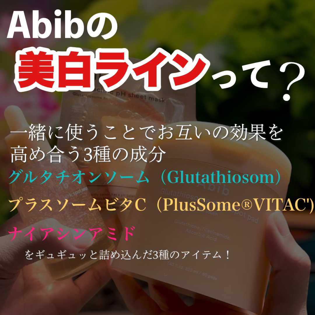 ナイアシンアミド、PlusSome® Vita C、Glutathiosomeの3つの成分でシミやくすみ改善! 塗ると肌の上で弾けるグルタチオンカプセル! ひたひたの美容液と大きめのパッドがうれしい😄 柔らかめで厚いパッドがピタッとくっつき部分ケアにとてもいいなと思いました! Abibの美白ラインは 夏の紫外線が気になる方、くすみシミを改善したい方に特におすすめです👍👍