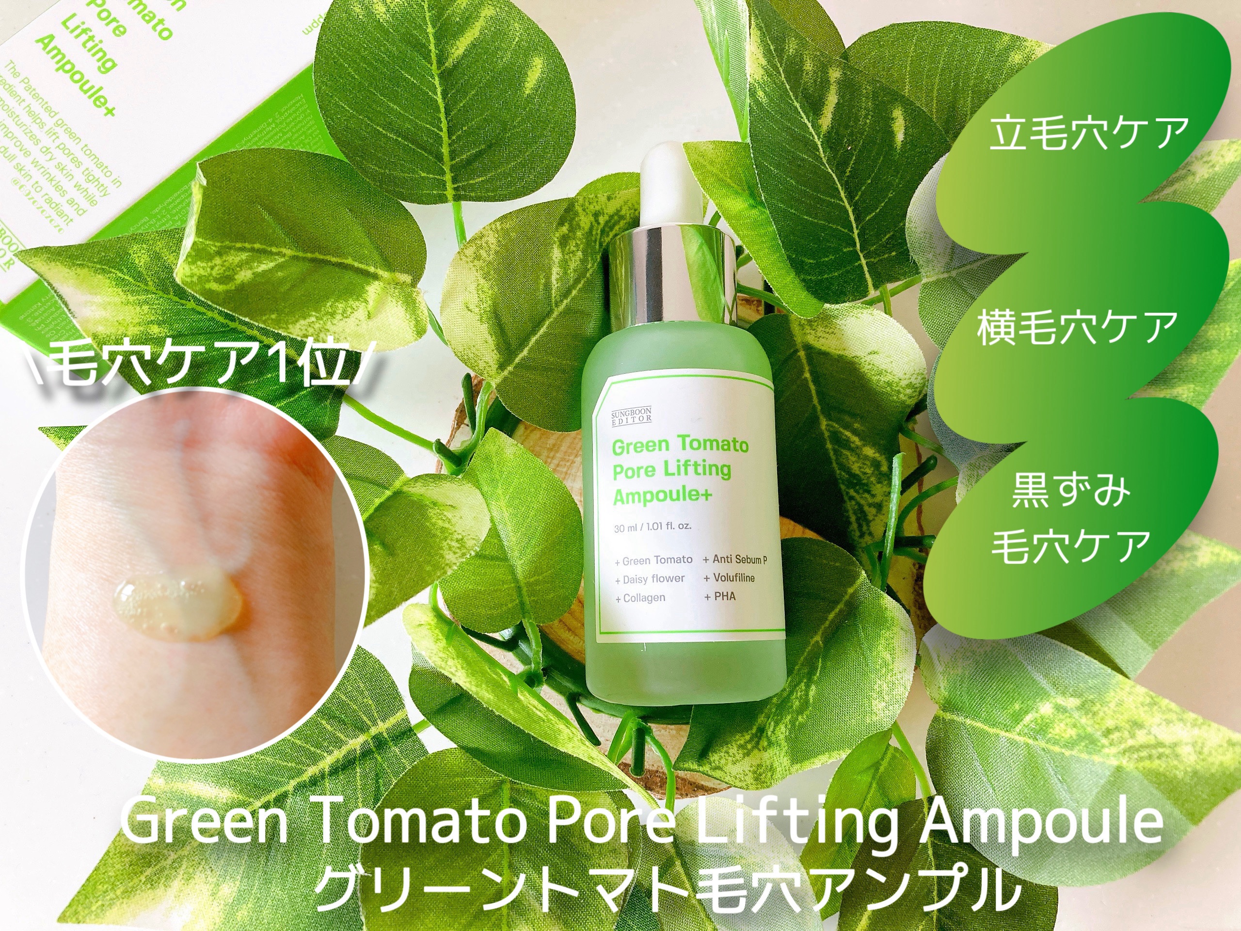 成分エディターグリーントマトポアリフティングアンプル縦毛穴、横毛穴、メラニン毛穴の気になる3種の毛穴にアプローチ!毛穴が気になっている方におすすめなアンプル😊低刺激テスト済みで朝も夜も使用可能!とろみがあるテクスチャーのアンプルを満べんなく塗...