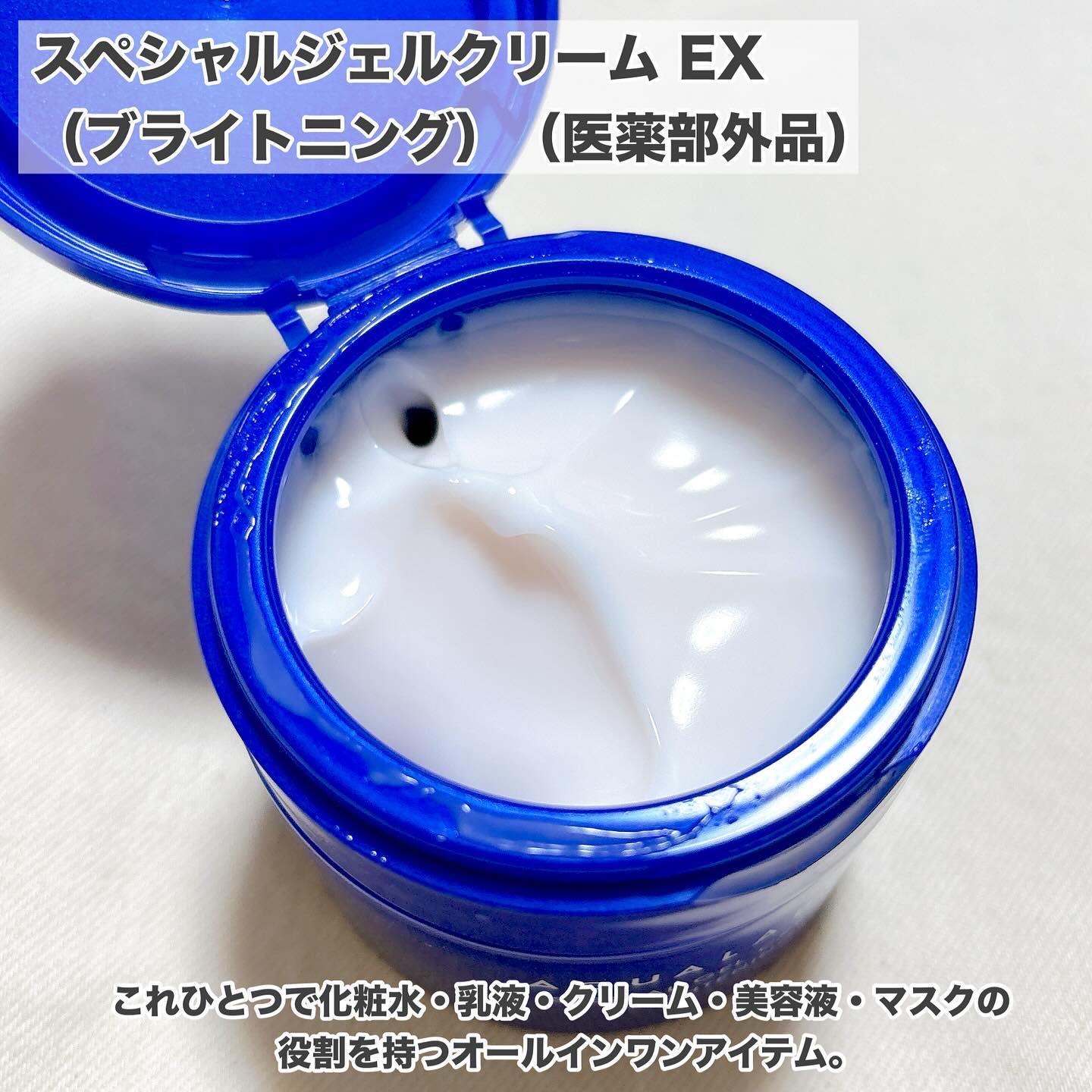 うるっと白玉みたいな透明美肌に💙 スペシャルジェルクリーム EX(ブライトニング)〔医薬部外品〕 資生堂独自の美白有効成分 '4MSK*'を惜しみなく届けてくれる青のオールインワン💙 柔らかジェルクリームがするっと伸びるよ 美白*²スキンケアで肌が柔らかくなるような優しい使い心地を感じられるのはとても嬉しかった💙