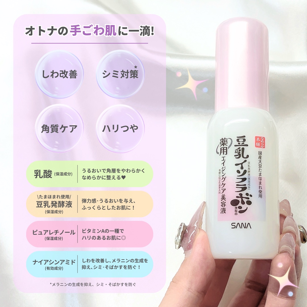 - 【医薬部外品】 浸透*1して、ハリ・弾力感 大人の角質ケア美容液 無香料・無着色・無鉱物油 豆乳発酵液含有の薬用エイジングケア*2美容液 しわ改善&シミ対策できる豆乳の角質ケア美容液 シミ対策:メラニンの生成を抑え、シミ・そばかすを防ぐ 有効成分ナイアシンアミドがお肌の奥まで届く! 角質にアプローチしながら、ハリ・透明感のある素肌へ。 乾燥が気になる大人のお肌に 乳酸(保湿成分):うるおいで角層をやわらかくなめらかに整えます。 豆乳発酵液(保湿成分):弾力感・うるおいを与え、ふっくらとした質感のお肌に。 ピュアレチノール(保湿成分):ビタミンAの一種で、ハリのあるお肌に。 ナイアシンアミド(有効成分):しわを改善し、メラニンの生成を抑え、シミ・そばかすを防ぎます。 ごわつきが気になるときに・・・コットン使い! 洗顔後、化粧水の前にコットンに適量(3プッシュ程度)をとり、お顔全体にやさしくくるくると広げてなじませてください。 つるんとハリ・透明感! 国産丸大豆「たまほまれ」使用 なめらか本舗「エイジングケアライン」オリジナルの豆乳発酵液(保湿成分)は、国内で栽培された大豆「たまほまれ」を丸ごと使用して作られています。 なめらか濃縮製法でつくるオリジナルの豆乳発酵液 豆乳発酵液に使用している大豆は、遺伝子組換えなし大豆を使用しています。 ●パッチテスト済み ●アレルギーテスト済み (すべての方に皮フ刺激やアレルギーが起きないわけではありません。) *1角層まで *2年齢に応じたお手入れ