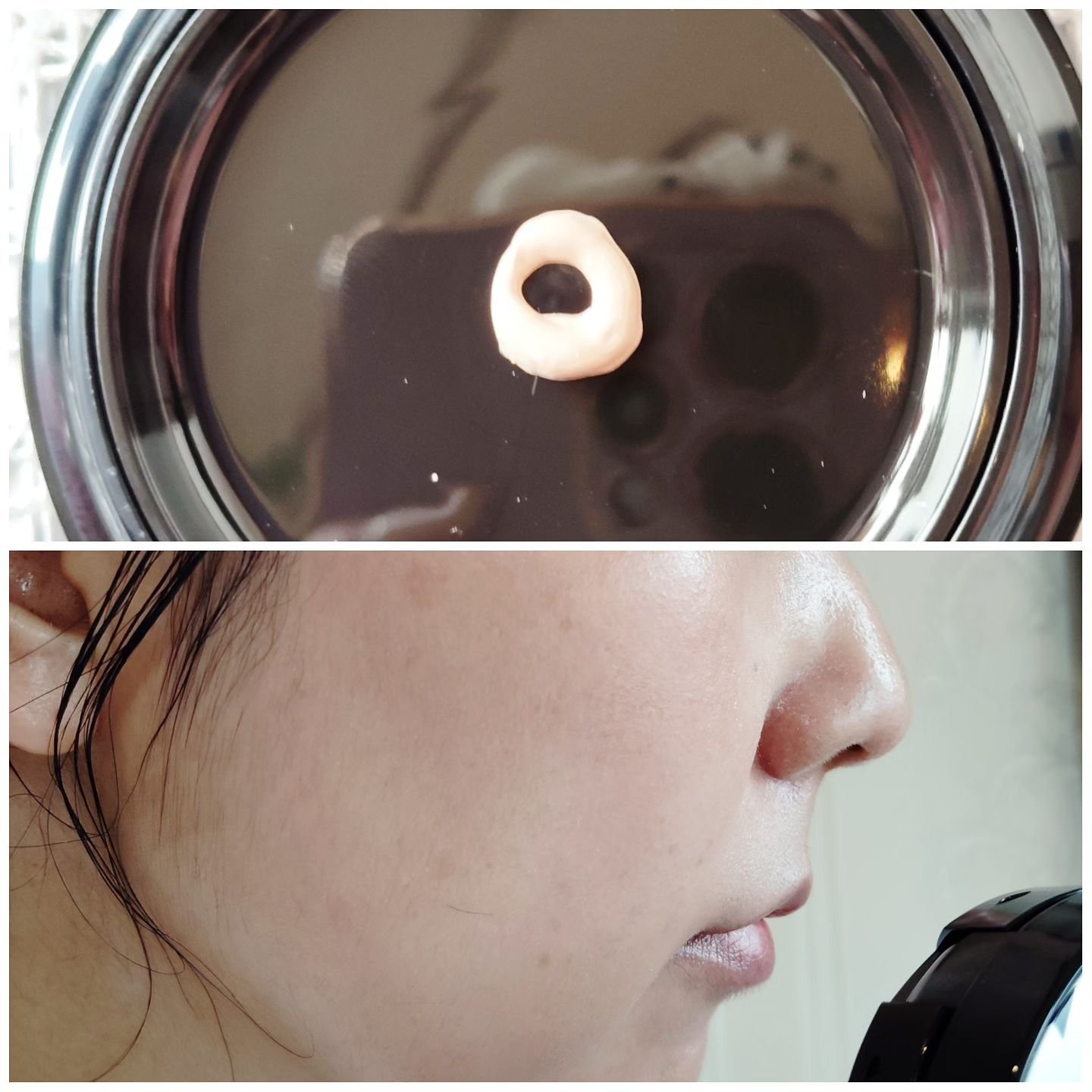 まずケースだけでなく、パフも卵形をしてます✨ ティルティルの場合は付属パフが使いやすかったです‼️ こちらは、クッションがあまり沈まないタイプなので、少量ずつパフにとりやすかったです☺️ そして肌に叩き込んで行くのですが、なかなかカバー力はあるものの、自然に馴染む感じ。 そして本当にマスクに色がうつらない‼️ あと、72時間もさすがにつけっぱなしにはしませんが、朝つけてゴルフ練習などしっかり運動したあとも、崩れてなくキレイでした✨