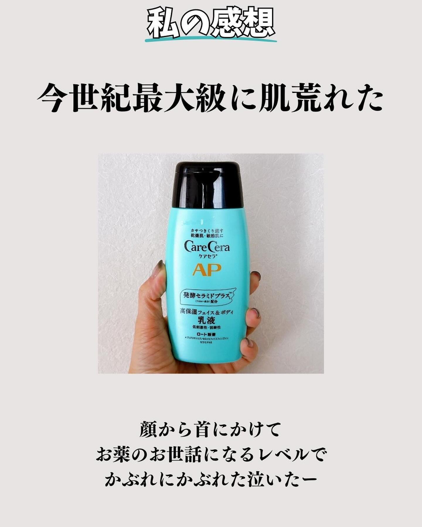 様々な媒体で色んな美容家さんが推しに推してたケアセラ乳液✨ 最近乾燥めっちゃ感じるから、保湿力高そうだし、お手頃価格だし買うしかないじゃーん♪ 保湿力高いし良いかも✨ って思って2~3日使ったんですよ、ええ。 そうしましたらですね、日に日に赤くかぶれてゆくお肌…(早く気付けよ、私!) 残念ながら私には合わなかったため、使用中断😢 敏感肌さんは、パッチテストをオススメいたします~。