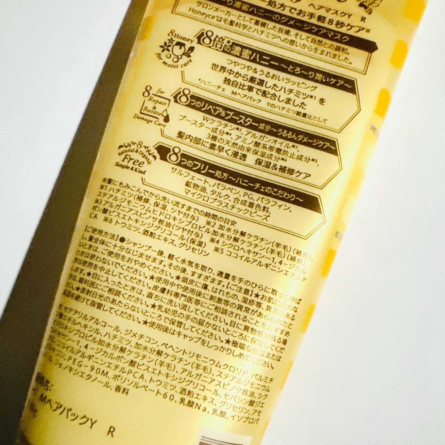 - 累計販売実績100万本*1 の大人気アイテムが改良復刻! 【とろ~り濃蜜ハニーのダメージケアマスク】 ハニーブースター処方でお手軽8秒*2 時短ケア! サロンメーカーとして蓄積した技術、そして自然との調和。 ハニーチェは毛髪科学とハチミツへの想いから生まれました。 ■こだわり&パワーアップポイント■ 【ポイント01】 『8倍*3 の濃蜜ハニー ~とろ~り潤いケア~ 』 世界中から厳選したハチミツ*4 を独自比率で配合、髪にツヤを与えうるおいでラッピングします。 【ポイント02】 『8つのリペア&ブースター成分 ~うるるんダメージケア~ 』 Wケラチン*5、アルガンオイル*6、ブースター成分*7、アミノ酸系帯電防止成分*8、 3種の天然由来保湿成分*9 配合で、髪内部に素早く浸透し、保湿&補修ケア。 【ポイント03】 『8つのフリー処方 ~ハニーチェのこだわり~ 』 サルフェート、パラベン、PG、パラフィン、鉱物油、タルク、合成着色料、マイクロプラスチックビーズ不使用。 ハニーチェが誕生以来大切にしてきた髪と肌を想うこだわりのフリー処方。 *1 2013年8月~累計出荷実績、*2 髪にもみこんでから洗い流すまでの時間の目安、*3 ハニーチェ Mへアパック Yのハチミツ総量比として、*4 ハチミツ(補修、保湿、ツヤ付与)、*5 加水分解ケラチン(羊毛)(補修)、ステアルジモニウムヒドロキシプロピル加水分解ケラチン(羊毛)(補修)、*6 アルガニアスピノサ核油(ツヤ付与)、*7 シクロヘキサン-1,4-ジカルボン酸ビスエトキシジグリコール(保湿)、*8 ココイルアルギニンエチルPCA、*9 トウミツ、酒粕エキス、グリセリン