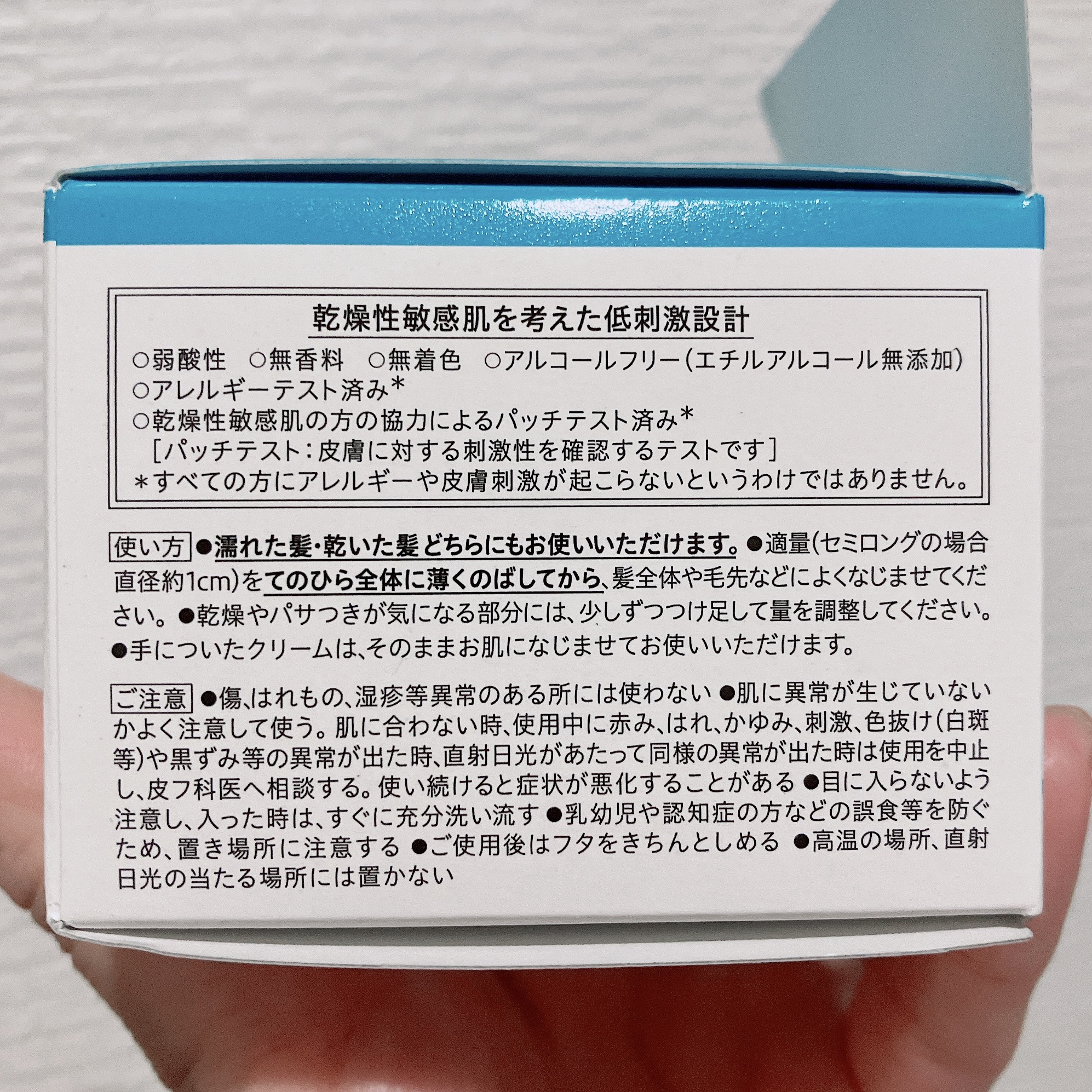 乾燥性敏感肌に悩んでいる私が試してみたかったモノ 🍀髪にヘアケアなどを付けて、その髪が顔に触れるのって嫌じゃない??ところがこれは触れてもいいの! 使用後の髪は、驚くほどしっとりとまとまり、乾燥によるパサつきが抑えられ、広がりも気にならなかった 濡れた髪にも乾いた髪にも使えるので、とても便利♡ テクスチャーは少し重めだけど手でのばして塗布すると髪に均一に馴染みやすいよ!