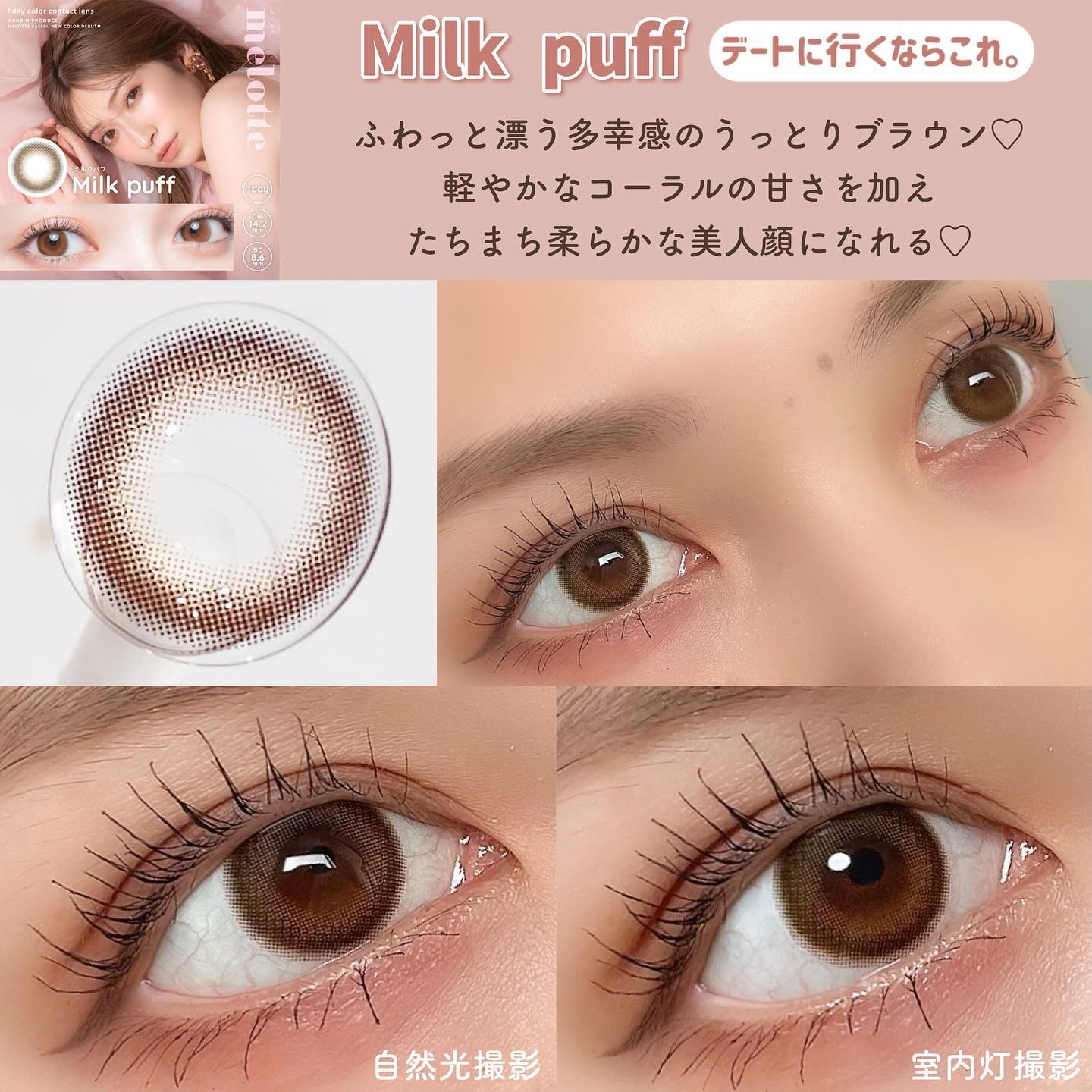 自然にみせたい、こっそり盛りたい時に良い。 学校、カラコン厳しい職場にも◎ 白みのあるグレージュにほんのりモーヴ感可愛すぎる〜!! 何この組み合わせヤバいです😖💓 大人フェミニンに少し甘さが足された感じがたまらんです🫶🏻️💓