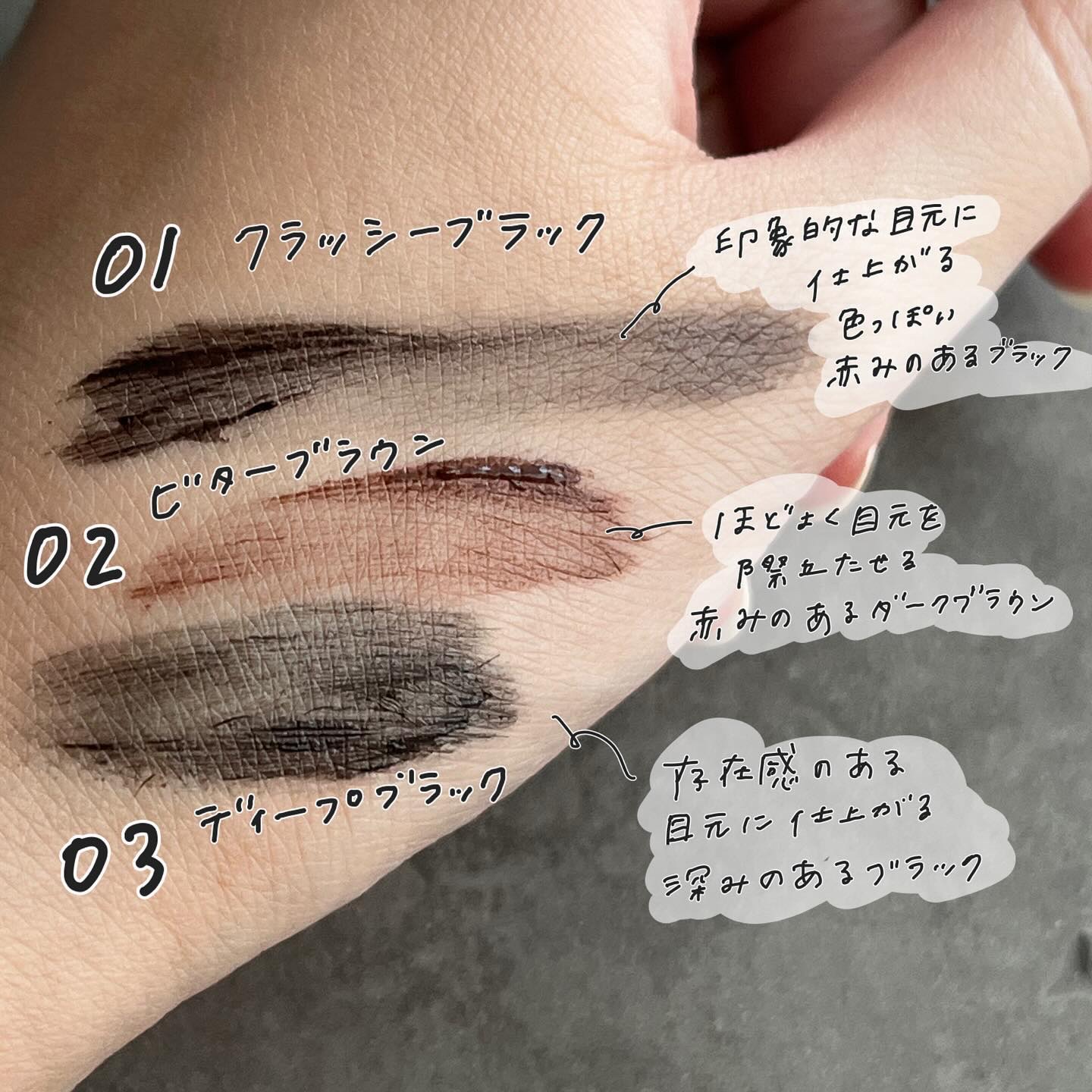 濃密発色の漆黒ブラック、自然なブラウン、ビターブラウンと 抜け感が出せるダークグレージュ、ウォームブラウン。 7.85mmという、極細ラインが安定して描き続けられるよう研究されてて、 シャープな細いラインを維持しやすく、液含みの良さとしっかりしたコシを実現した筆! どこを持っても指先がフィットする形状で、すごく持ちやすくて描きやすい✨ そして汗、水、涙に強いので1日経っても擦れなかったです。