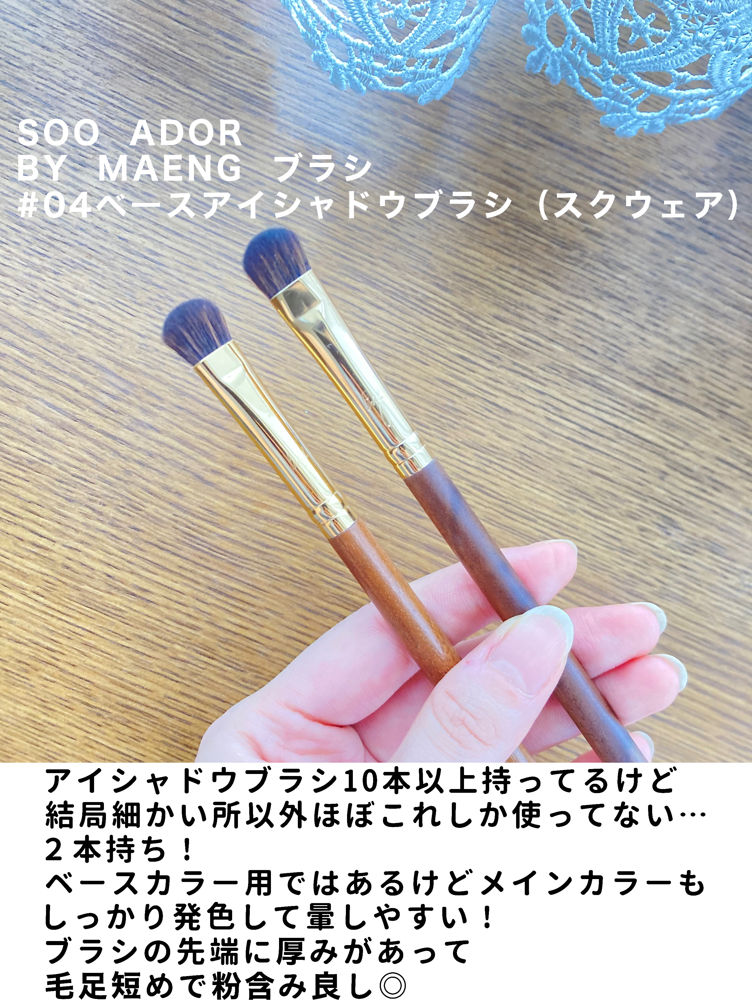 密度が高くふわふわと柔らかいので肌あたりが良い。塗るのはもちろん、叩いて密着させるのにも使える。ムラなく伸ばせて毛の跡も残りづらく人気なブラシ 全てのテクスチャのアイシャドウの粉飛びを抑え見たまま発色を叶えてくれる。このサイズのアイシャドウブラシは1つ持っておいて間違いない! 斜めカットのスリムなブラシで目尻、三角ゾーン、涙袋、アイライン等マルチに使える○このサイズはなかなか売ってないから要チェック👀
