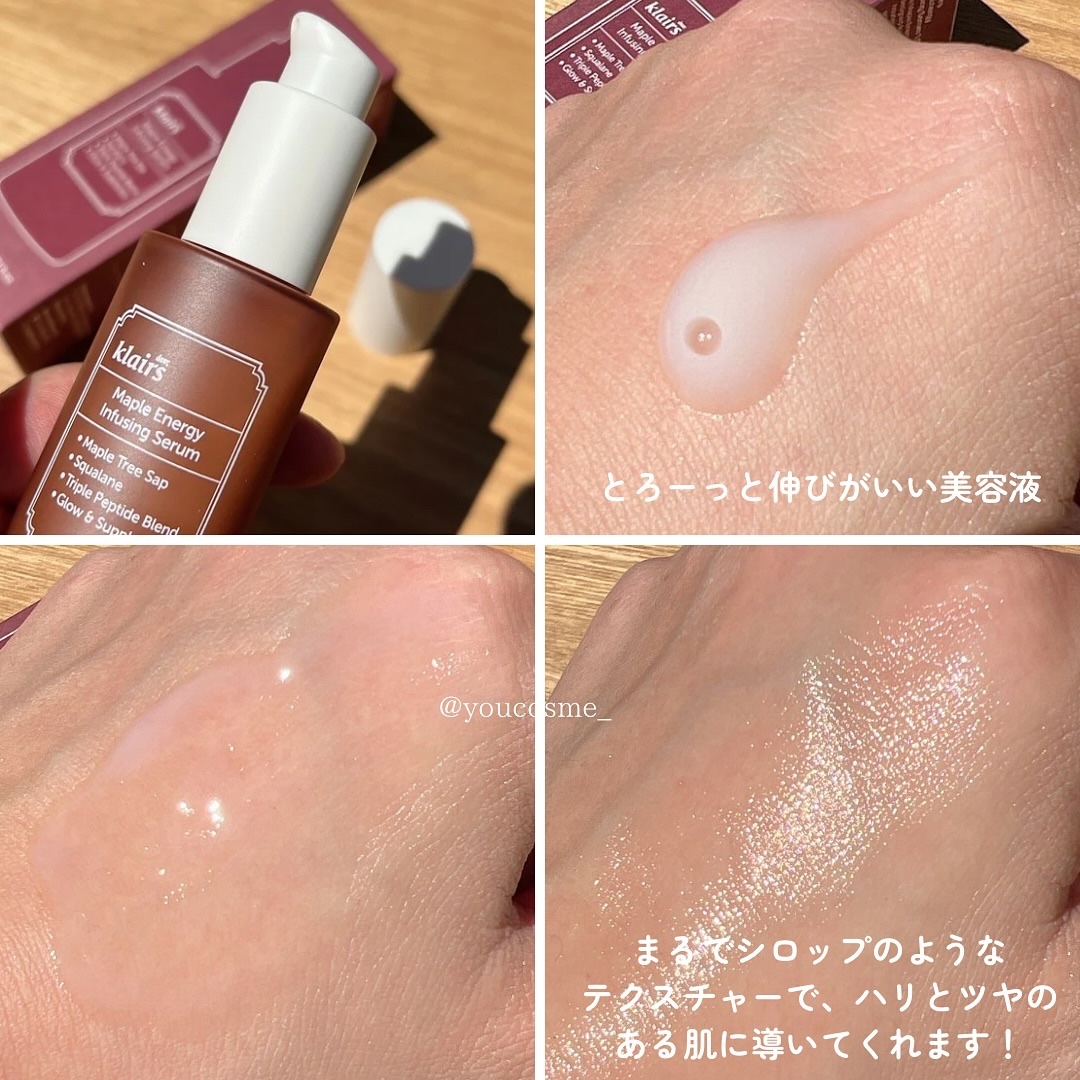 メープルの樹液とは?氷点下5度から20度に迫るカナダの厳しい冬を乗り越えるために蓄えている水分で1年にたった一度しか採取できない、樹液で栄養素が豊富でお肌の弾力アップが期待出来ます👌 メープルエナジーインフュージングセラムは、外部からの刺激によって傷んだ水分バリアの改善や、弾力の改善、ツヤ改善の効果が期待できるシロップセラムです✨ 私の使用しての感想はもっちりとしたテクスチャーで、重ね塗りしてもベタつかずしっとりとした使用感でした👌