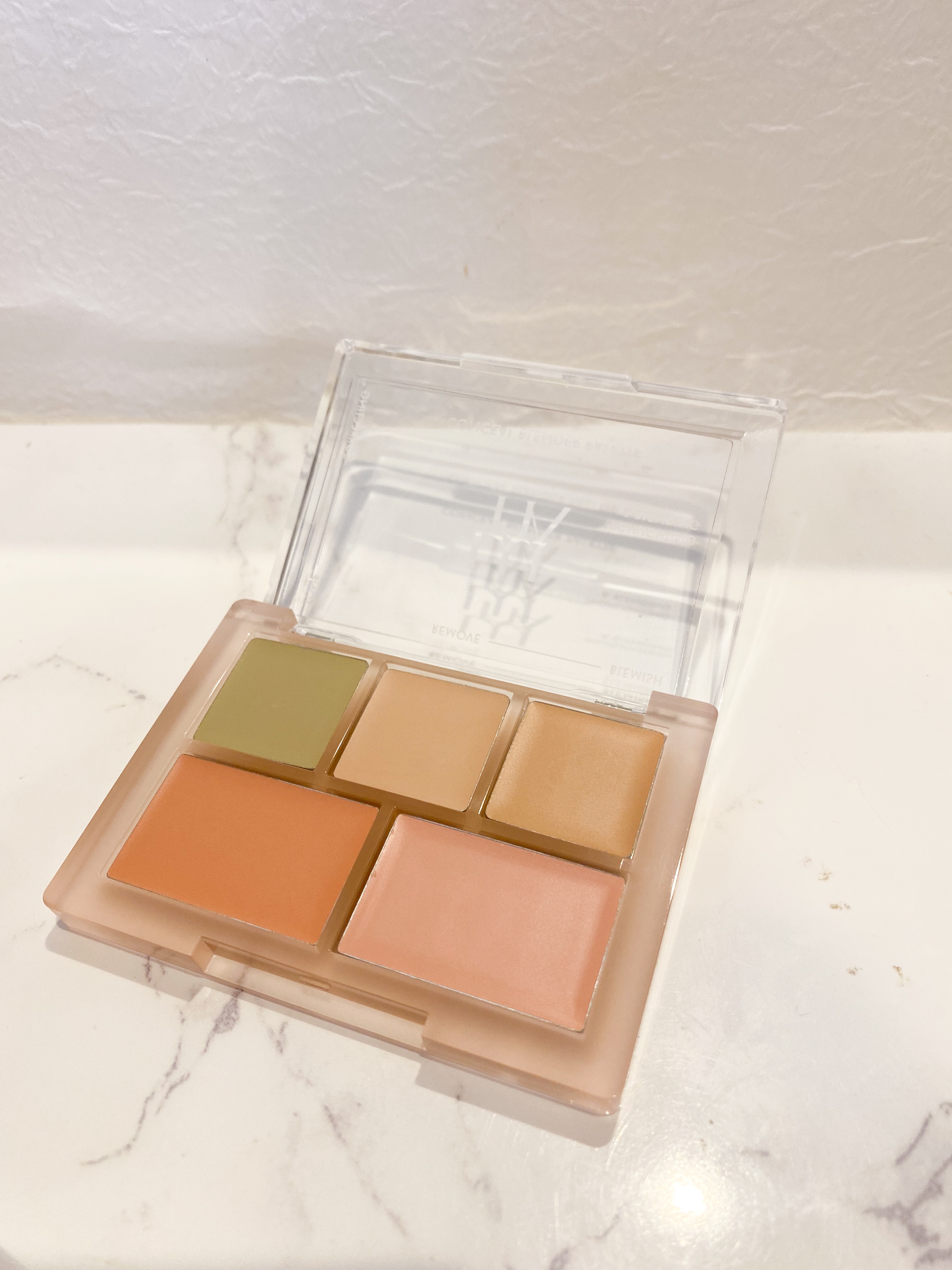 こちらは肌色や目的に応じて自在に色をブレンドできる、5色入りコントロールカラーパレットです。 ポイントで使ったり、赤みにはグリーン!っほんとに赤みがいい感じにかくれちゃう。 流行りのカラー少なめの綺麗な素肌メイクがつくれちゃう!