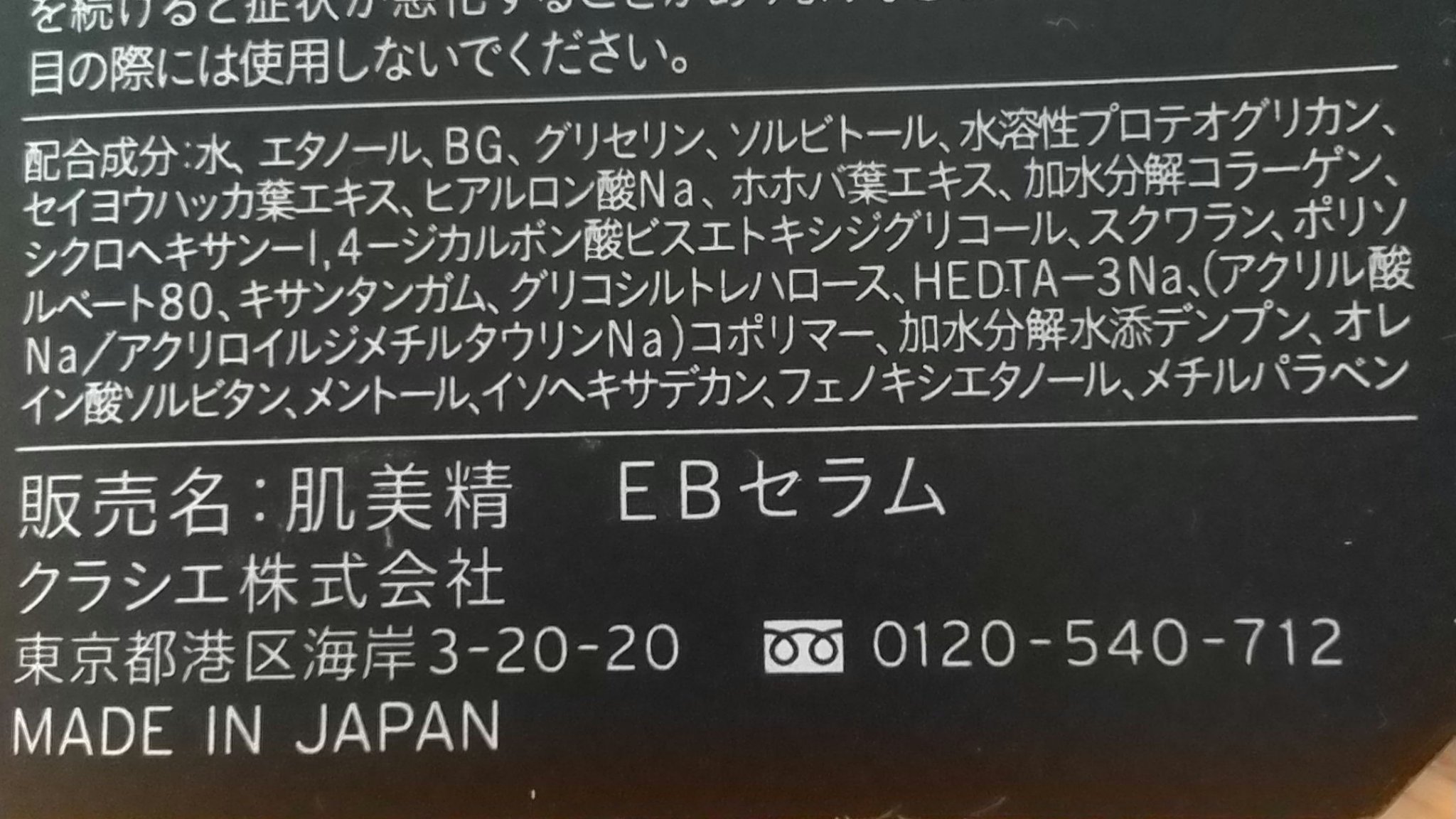 - <25g> 水、エタノール、BG、グリセリン、ソルビトール、水溶性プロテオグリカン、セイヨウハッカ葉エキス、ヒアルロン酸Na、ホホバ葉エキス、加水分解コラーゲン、シクロヘキサン-1,4-ジカルボン酸ビスエトキシジグリコール、スクワラン、ポリソルベート80、キサンタンガム、グリコシルトレハロース、HEDTA-3Na、(アクリル酸Na/アクリロイルジメチルタウリンNa)コポリマー、加水分解水添デンプン、オレイン酸ソルビタン、メントール、イソヘキサデカン、フェノキシエタノール、メチルパラベン