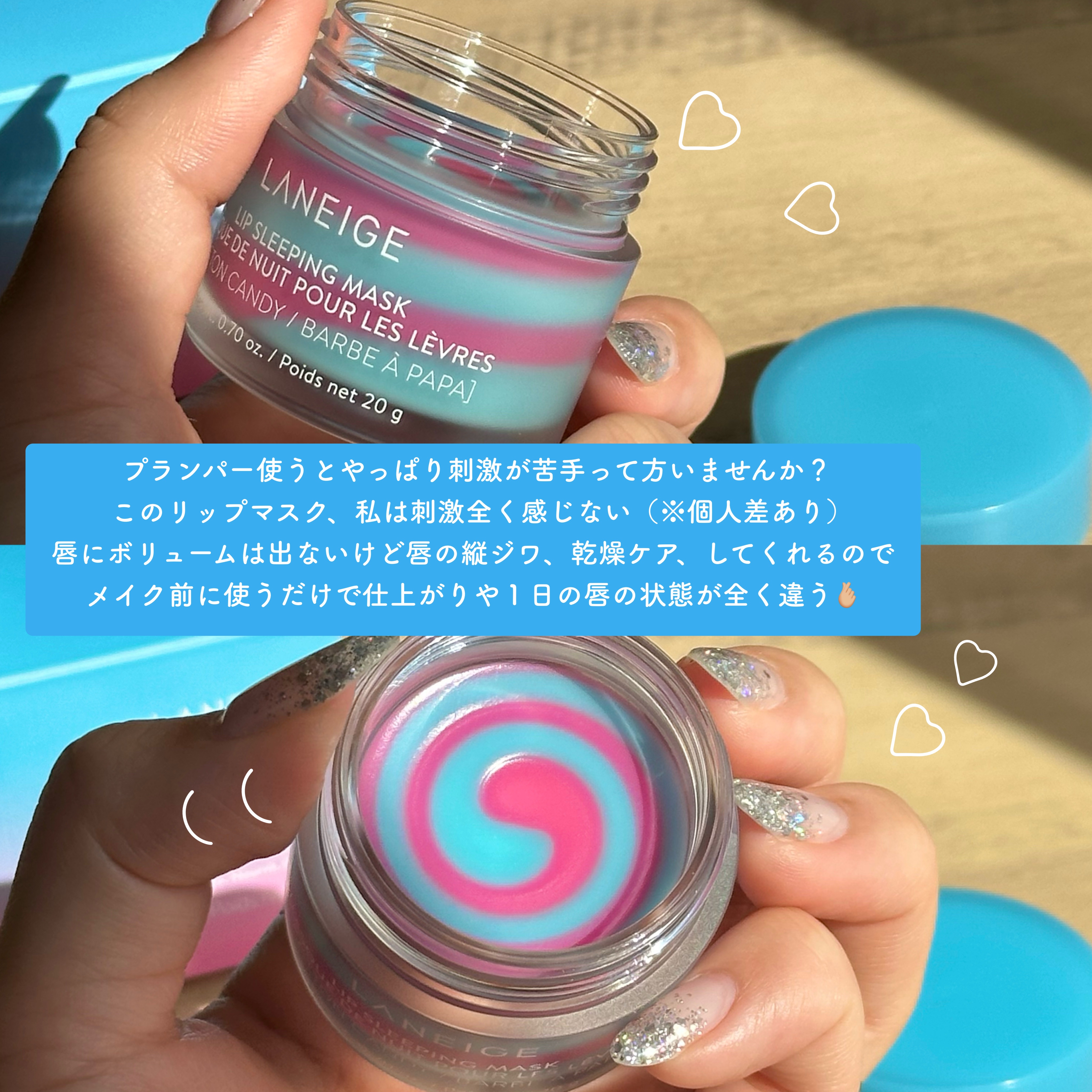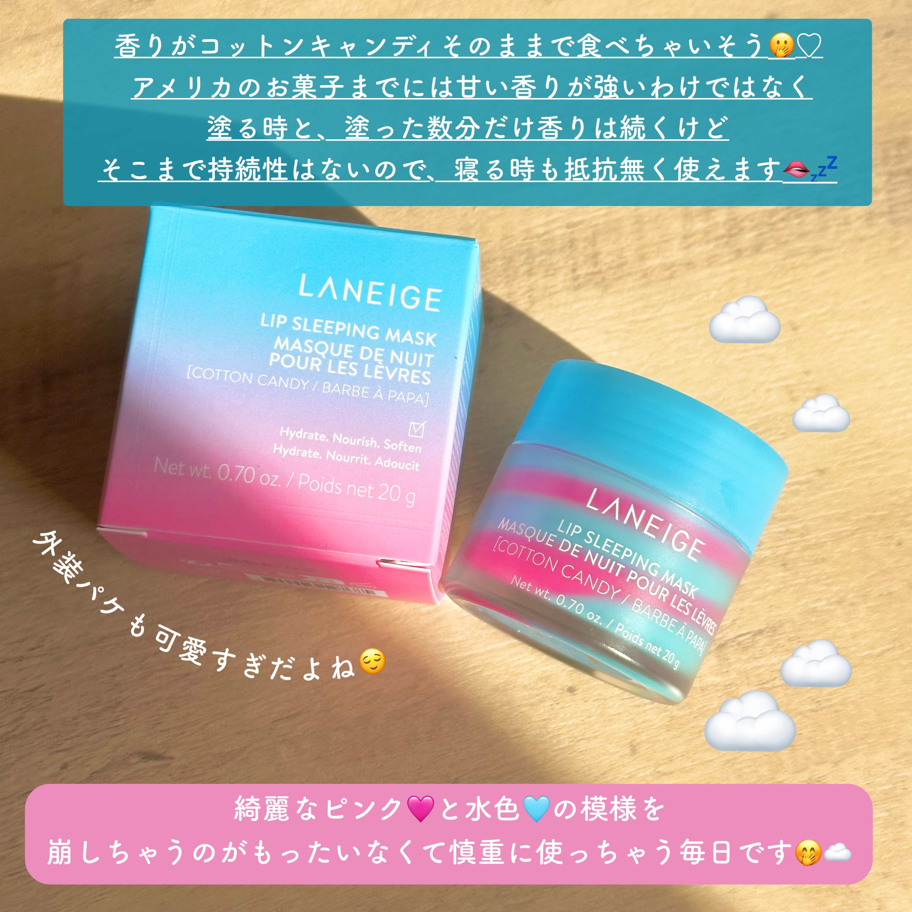 可愛すぎるリップスリーピングマスク🍭 とにかく見た目が可愛すぎる…💖 わたあめの香りなのですが、強すぎない香りで🙆♀️ LANEIGEのリップスリーピングマスクはリピート4個目✨️✨️ 最初に購入する時は、保湿リップに2000円…?!と思うのですが、コスパが良すぎて半年以上もちます(夜に毎日使う場合。個人差はあると思います💦) ちゃんと保湿してくれるし、見た目にも匂いにも癒される💗 気になった方は是非チェックしてみてください!