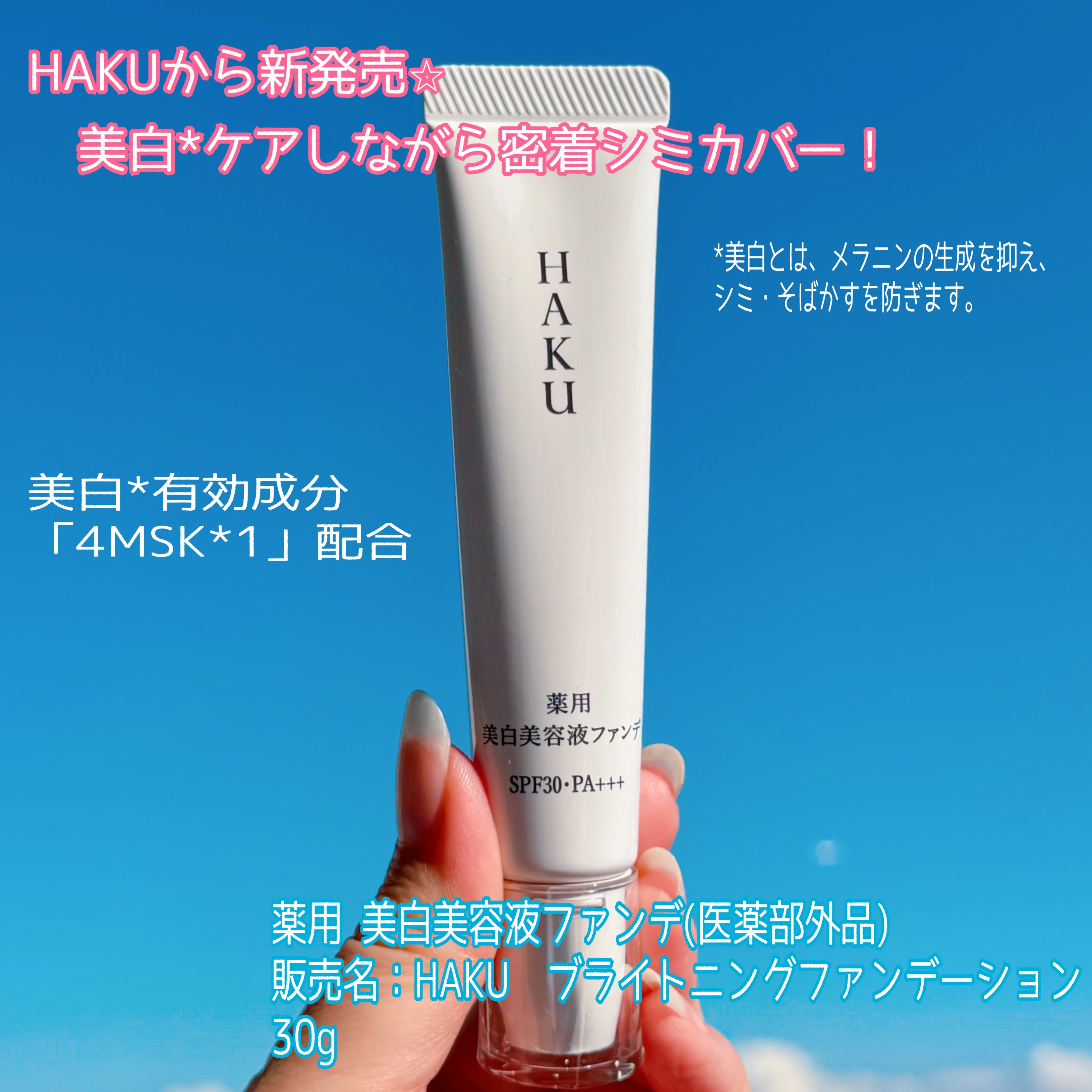 - SPF30 PA+++ 美白ケアしながら密着してシミカバーするファンデーション。 美白有効成分がメラニンの生成を抑え、シミ・そばかすを防ぎます。 軽やかに広がり、気になるシミや色ムラに密着して目立たせず、みずみずしいうるおいが長時間続きます。 明るく自然な仕上がりで、シミの目立たない、美発光肌へ。 無香料 (販売名:HAKU ブライトニングファンデーション)