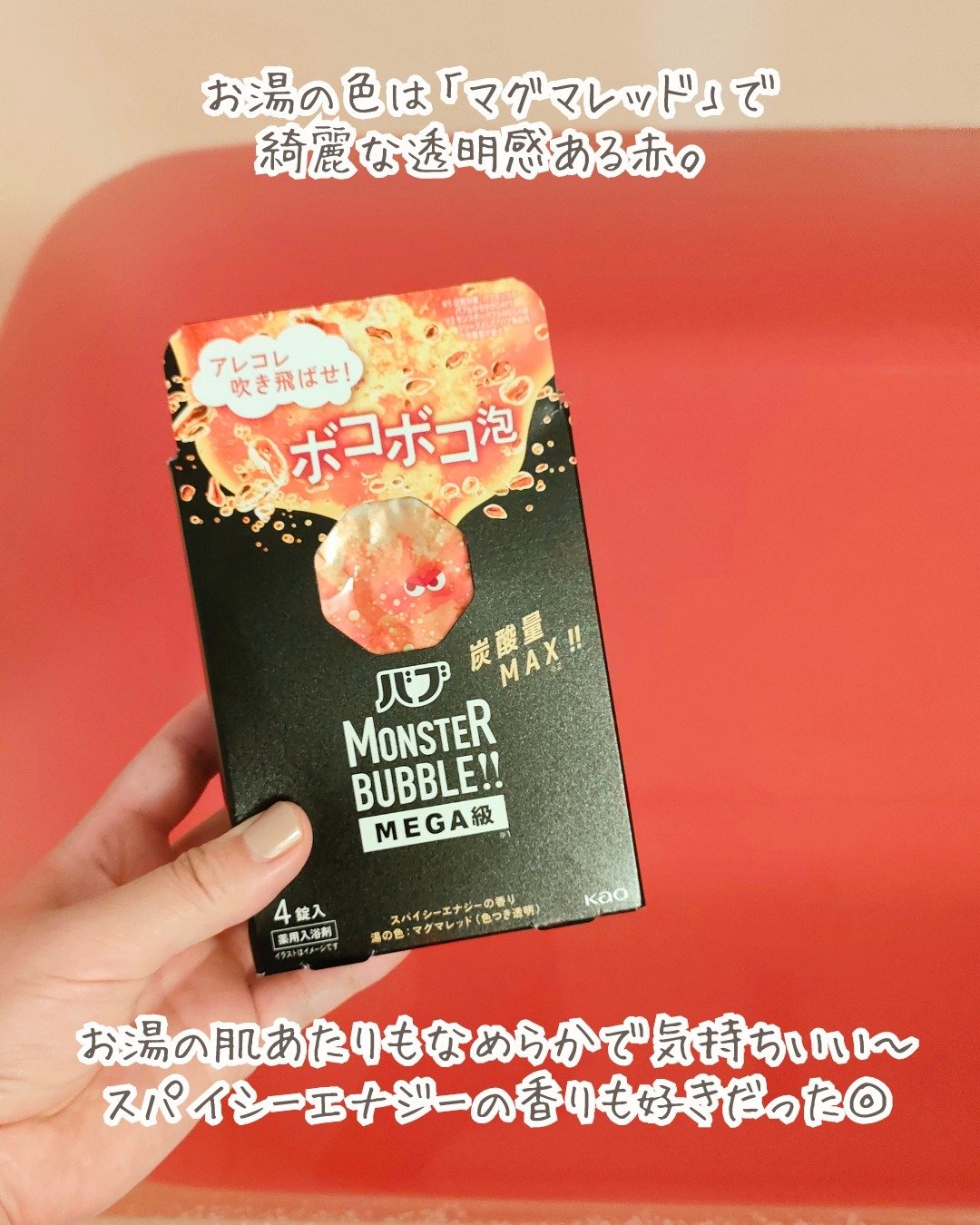- 【医薬部外品】 この発散*1入浴、きっとクセになる。 溜まったアレコレ吹き飛ばして、じっくりオフロを楽しもう! 湯面湧きたつボコボコ泡。 ●MEGAタブレット*2 ●炭酸量MAX*3 ●温浴効果を高め、疲労回復 ●スパイシーエナジーの香り *1炭酸泡がはじけること *2比較対象:当社バブモンスターバブルかろやかDAYS *3モンスターバブルMEGA級シリーズとして、バブ製品内で炭酸量が最大 湯の色:マグマレッド(色つき透明) スパイシーエナジーの香り