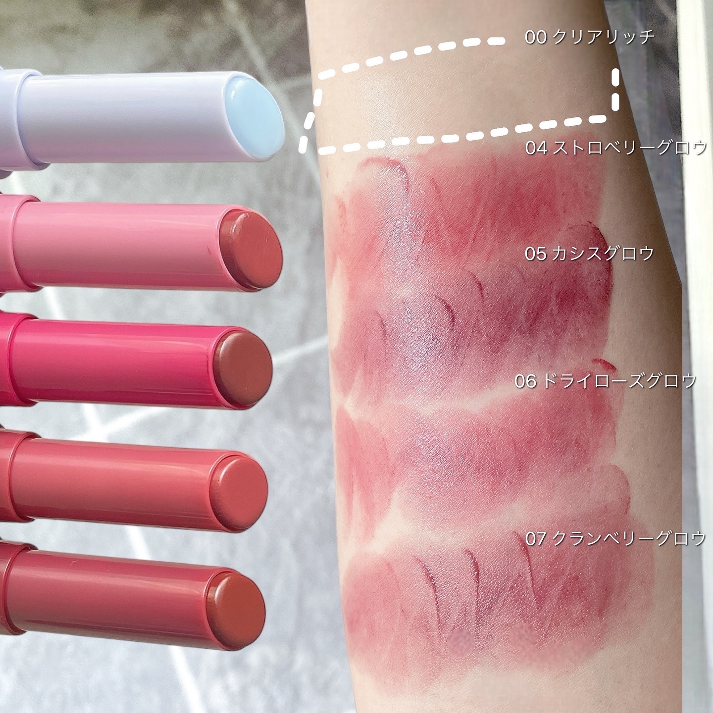 - <00 クリアリッチ> トリメリト酸トリトリデシル、ポリイソブテン、リンゴ酸ジイソステアリル、マイクロクリスタリンワックス、ホホバ種子油、セレシン、イソノナン酸イソノニル、ビスジグリセリルポリアシルアジペート-2、エチルヘキサン酸セチル、ポリエチレン、ヒアルロン酸Na、加水分解コラーゲン、スクワラン、アロエベラ葉エキス、アロエベラ花エキス、ウコン根エキス、カミメボウキ葉エキス、コクシニアインディカ果実エキス、サンゴモエキス、ナス果実エキス、メボウキ花/葉エキス、メリアアザジラクタ葉エキス、メリアアザジラクタ花エキス、ローズマリー葉エキス、アボカド油、アマ種子油、アルガニアスピノサ核油、オリーブ果実油、ヒマワリ種子油、マカデミア種子油、ヤシ油、ミネラルオイル、酢酸トコフェロール <04 ストロベリーグロウ> トリメリト酸トリトリデシル、ポリイソブテン、リンゴ酸ジイソステアリル、マイクロクリスタリンワックス、ホホバ種子油、セレシン、イソノナン酸イソノニル、ビスジグリセリルポリアシルアジペート-2、エチルヘキサン酸セチル、ポリエチレン、ヒマワリ種子油、ヤシ油、アマ種子油、アボカド油、アルガニアスピノサ核油、マカデミア種子油、オリーブ果実油、ローズマリー葉エキス、酢酸トコフェロール、スクワラン、アロエベラ葉エキス、ミネラルオイル、ヒアルロン酸Na、加水分解コラーゲン[+/-]酸化チタン、赤201、青1、酸化鉄、マンガンバイオレット、赤202、黄4 <05 カシスグロウ> トリメリト酸トリトリデシル、ポリイソブテン、リンゴ酸ジイソステアリル、マイクロクリスタリンワックス、ホホバ種子油、セレシン、イソノナン酸イソノニル、ビスジグリセリルポリアシルアジペート-2、エチルヘキサン酸セチル、ポリエチレン、ヒマワリ種子油、ヤシ油、アマ種子油、アボカド油、アルガニアスピノサ核油、マカデミア種子油、オリーブ果実油、ローズマリー葉エキス、酢酸トコフェロール、スクワラン、アロエベラ葉エキス、ミネラルオイル、ヒアルロン酸Na、加水分解コラーゲン[+/-]酸化チタン、赤201、青1、酸化鉄、マンガンバイオレット、赤202、黄4 <06 ドライローズグロウ> トリメリト酸トリトリデシル、ポリイソブテン、リンゴ酸ジイソステアリル、マイクロクリスタリンワックス、ホホバ種子油、セレシン、イソノナン酸イソノニル、ビスジグリセリルポリアシルアジペート-2、エチルヘキサン酸セチル、ポリエチレン、ヒマワリ種子油、ヤシ油、アマ種子油、アボカド油、アルガニアスピノサ核油、マカデミア種子油、オリーブ果実油、ローズマリー葉エキス、酢酸トコフェロール、スクワラン、アロエベラ葉エキス、ミネラルオイル、ヒアルロン酸Na、加水分解コラーゲン[+/-]酸化チタン、赤201、青1、酸化鉄、マンガンバイオレット、赤202、黄4 <07 クランベリーグロウ> トリメリト酸トリトリデシル、ポリイソブテン、リンゴ酸ジイソステアリル、マイクロクリスタリンワックス、ホホバ種子油、セレシン、イソノナン酸イソノニル、ビスジグリセリルポリアシルアジペート-2、エチルヘキサン酸セチル、ポリエチレン、ヒマワリ種子油、ヤシ油、アマ種子油、アボカド油、アルガニアスピノサ核油、マカデミア種子油、オリーブ果実油、ローズマリー葉エキス、酢酸トコフェロール、スクワラン、アロエベラ葉エキス、ミネラルオイル、ヒアルロン酸Na、加水分解コラーゲン[+/-]酸化チタン、赤201、青1、酸化鉄、マンガンバイオレット、赤202、黄4