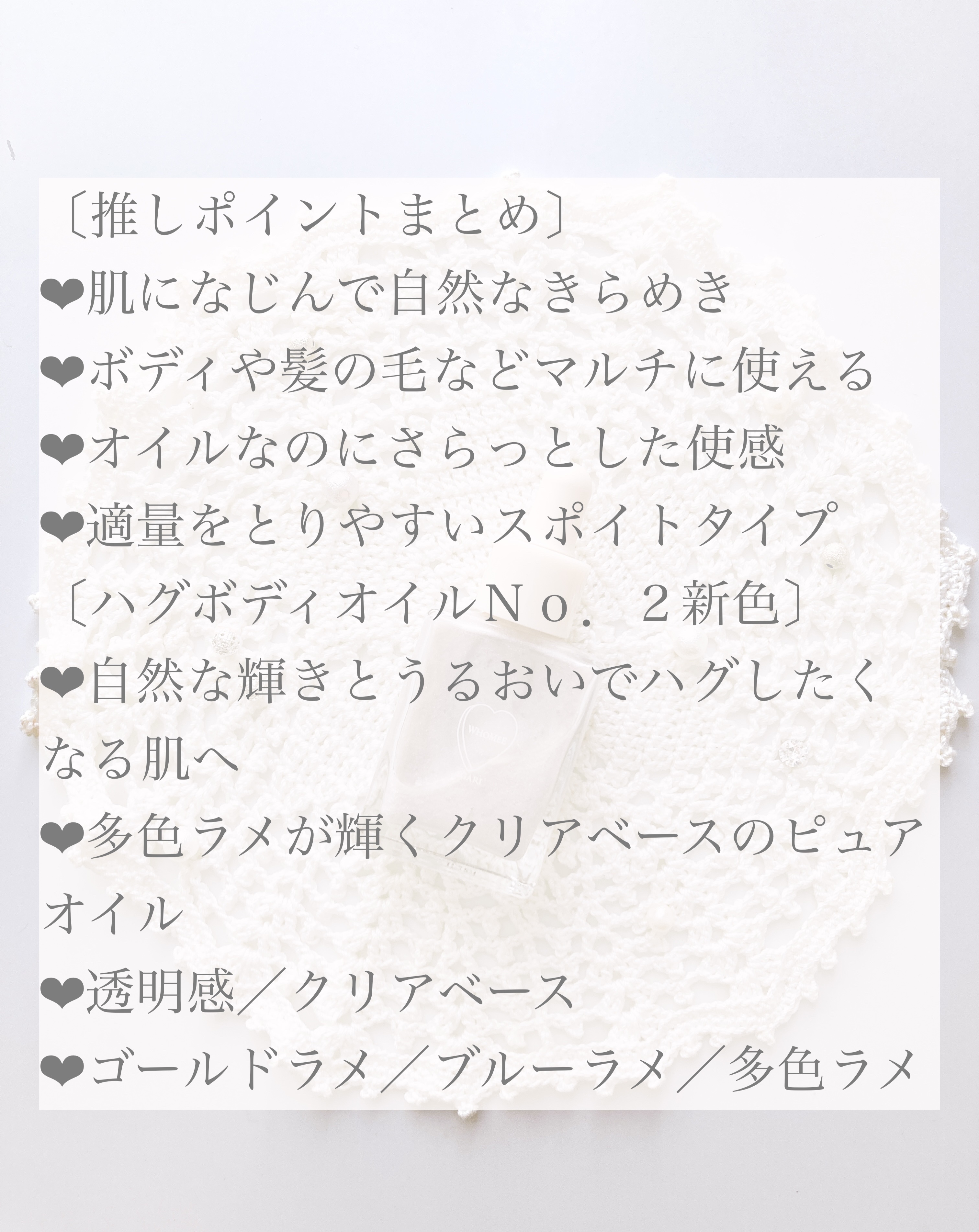 - 【数量限定】 ①マルチに使える 腕や脚、デコルテなどボディはもちろん、髪の毛にも使用することができます。 ②肌馴染みのいいピンクカラー 肌馴染みのいいコーラルピンクで肌に血色感※をプラス。髪に使用する場合にも浮かない、絶妙なピンクカラーに仕上げています。 ※メークアップ効果による ③自然なきらめき ゴールドラメをメインに、ピンクやオレンジなど様々なラメを贅沢に使用。自然なきらめきをプラスします。 ④さらっとしたオイル オイルだけどさらっとした使用感。 美容保湿成分配合※のためしっとりと保湿された仕上がりになります。 ※保湿成分 ・お肌:ヒマワリ種子油、スクワラン、ホホバ種子油、マカデミア種子油、オリーブ果実油、トコフェロール ・髪の毛:アルガニアスピノサ核油、コメヌカ油、(アブラナ種子油、シナアブラギリ種子油)コポリマー