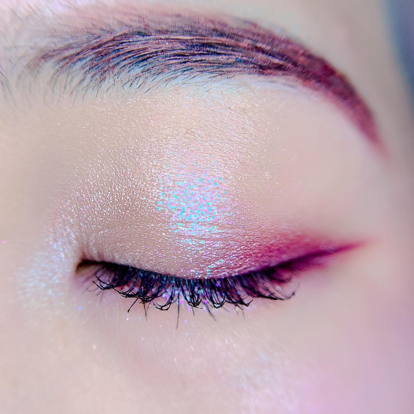 ベースに右上、目頭から黒目上に真ん中、黒目〜目尻に右下を、左上を目頭にくの字に塗ってもらいました✨ ピンクサクラよりもクールな感じで、目で見た色より私の肌では紫っぽく発色しました😍 上2つはラメはぎっしりでときめく💓 ブラウンメイクがとても苦手だけれどこれならブラウンメイク出来そう👌(かなり紫寄りですが) くすみ感は強いので苦手な方は厳しいかも…(特に真ん中) クールな印象になるので大人顔さん向けor大人顔になりたい方向けのイメージです✨