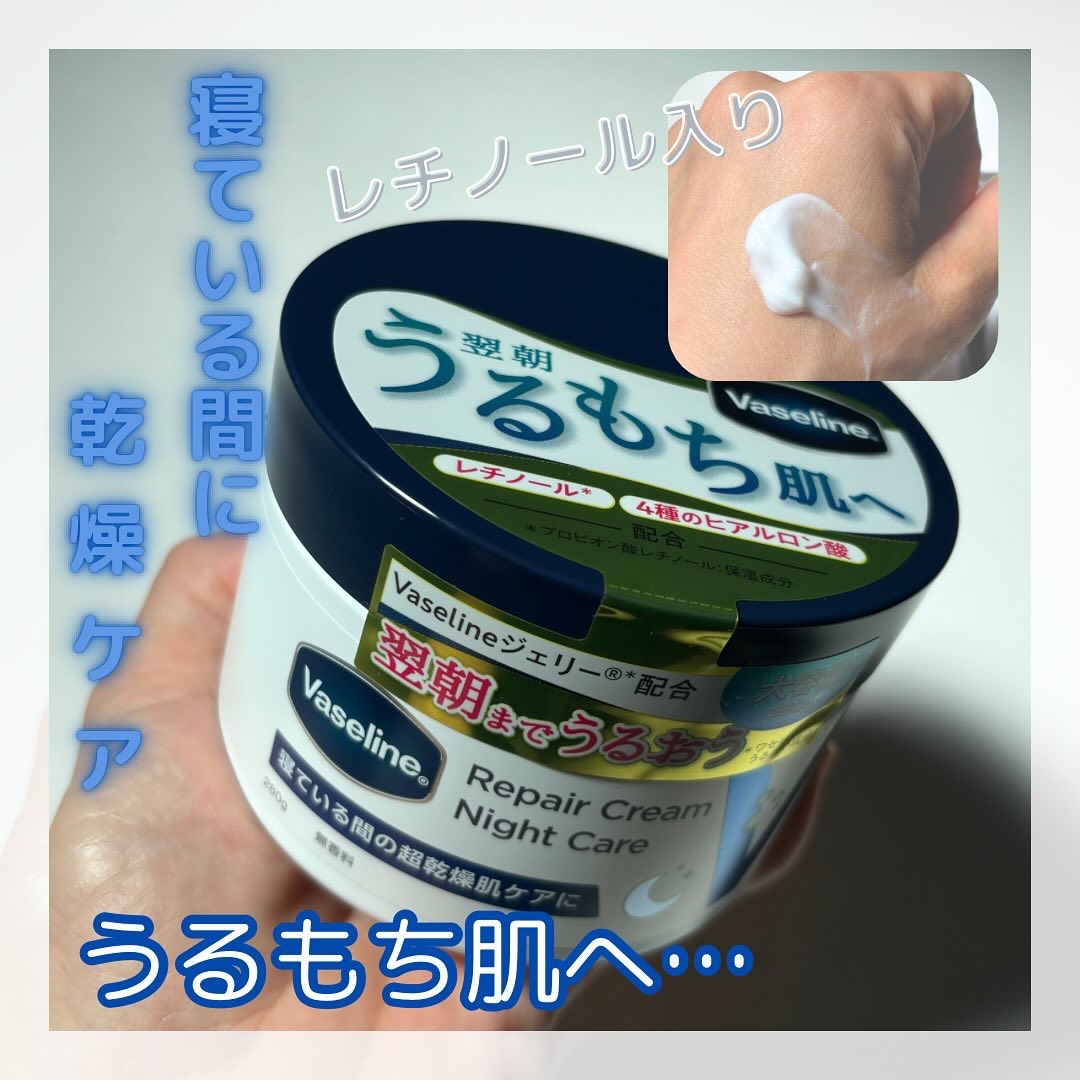 ヴァセリンから、超乾燥肌向けのナイトクリームが登場! べたつかずにスーッと肌になじむクリームが、超乾燥肌にも浸透し、うるおいを与えます。 保湿力がとにかく高くてしっとりもちもちの肌にしてくれます✨ 私は夜使いましたが、朝起きてもしっかり保湿されてました✨ 香りも良いので使う度に癒されます🍀*゜ 大容量なのでコスパも良いのが嬉しいです🙌