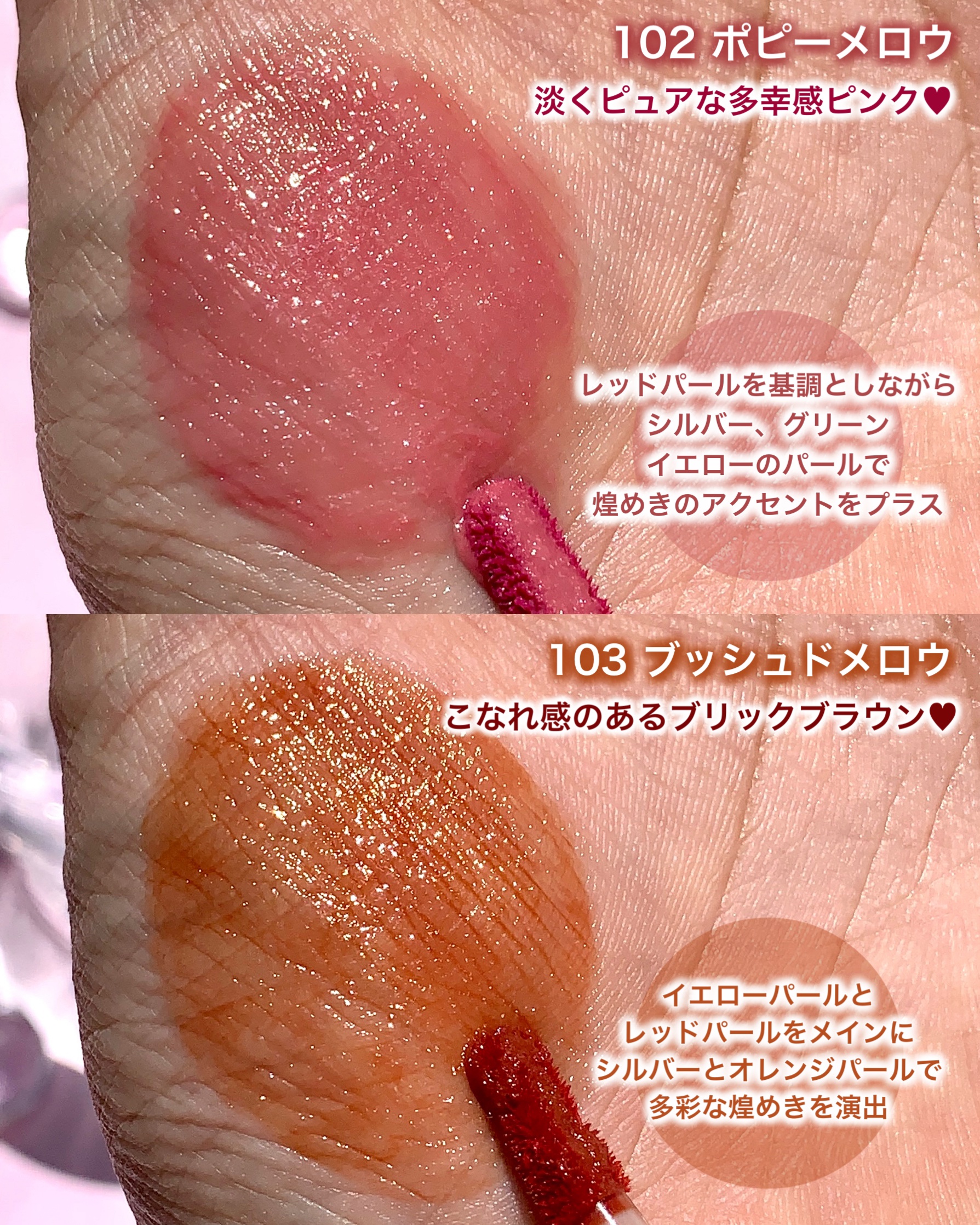 アクアベージュは 雫のようなブルーラメを閉じ込めた ヌーディな「水蜜桃リップ」 シマータンジェリンは 甘い蜜のようなゴールドラメをまとう まろやかな赤みオレンジ となっていて、どちらも春にピッタリな 可愛らしいカラーです🥰 アクアベージュは パソカ問わずに使いやすそうな 粘膜カラーとなっていて デイリー使いするなら断然こっちだと思います😊