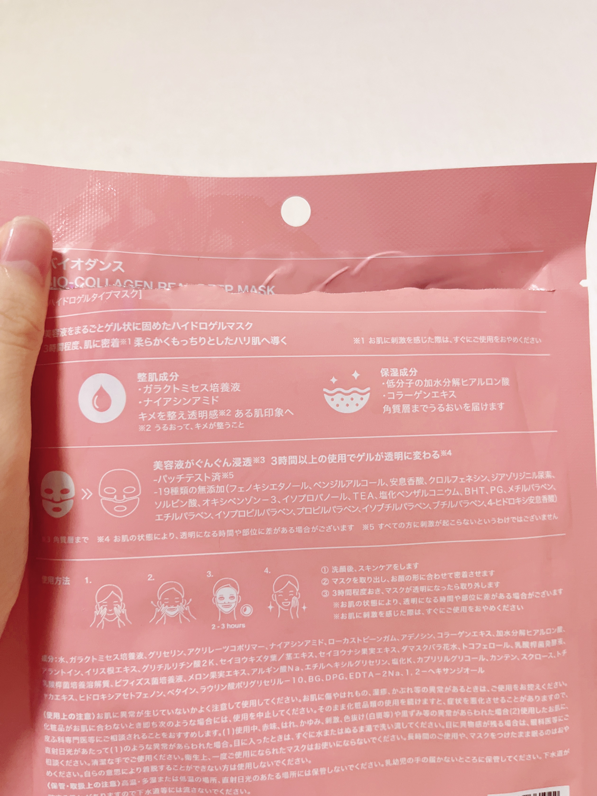 - <1枚> 精製水、コラーゲン抽出物、ガラクトミセス発酵濾過物、グリセリン、アクリレーツコポリマー、ナイアシンアミド、キャロップガム、アイリッシュモス抽出物、ベタイン、アルギン酸、ダイプロピレングリコー、カンテン、ヒドロキシアセトフェノン、1,2-ヘキサンジオール、塩化カリウム、ラウリン酸ポリグリセリル-10、カプリリルグリコール、スクロース、ブチレングリコール、アラントイン、エチルヘキシルグリセリン、ハイドロライズドハイアロロニックシード、アデノシン、ダイソジウムイディティエイ、セイヨウナシ果実抽出物、ダマスクバラ抽出液、イリス根抽出物、メロン抽出物、西洋松岳葉/茎抽出物、ジポタシウムグリシリゼート、ビフィーダ発酵濾過物、トコフェロール、ラクトバチルス桿菌発酵液、ラクトバチルス桿菌溶解質液 <4個入り> カプリリルグリコール、スクロース、エチルヘキシルグリセリン、ラウリン酸ポリグリセリル-10、ジポタシウムグリシリゼート、精製水、コラーゲン抽出物、ガラクトミセス発酵濾過物、グリセリン、アクリレーツコポリマー、ナイアシンアミド、キャロップガム、アイリッシュモス抽出物、ベタイン、アルギン酸、ダイプロピレングリコー、カンテン、ヒドロキシアセトフェノン、1,2-ヘキサンジオール、塩化カリウム、ブチレングリコール、アラントイン、ハイドロライズドハイアロロニックシード、アデノシン、ダイソジウムイディティエイ、セイヨウナシ果実抽出物、ダマスクバラ抽出液、イリス根抽出物、メロン抽出物、西洋松岳葉/茎抽出物、ビフィーダ発酵濾過物、トコフェロール、ラクトバチルス桿菌発酵液、ラクトバチルス桿菌溶解質液