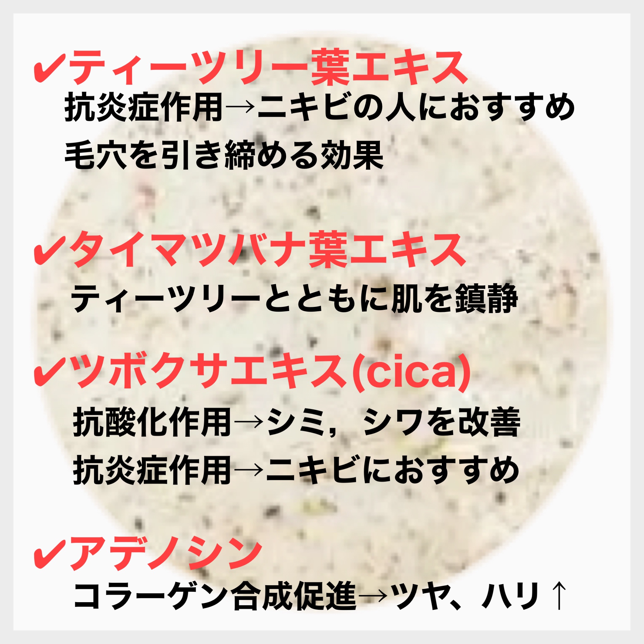 - <1枚> 水、メチルプロパンジオール、DPG、1,2-ヘキサンジオール、ヒドロキシアセトフェノン、パンテノール、BG、グリセリン、アデノシン、マコンブエキス、EDTA-2Na、タカサブロウ葉エキス、ティーツリー葉油、カルボマー、メチルジイソプロピルプロピオン酸アミド、ティーツリー葉エキス、オクチルドデセス-16、トロメタミン、キサンタンガム、フルクトオリゴ糖、ツボクサエキス、タイマツバナ葉エキス、β-グルカン、水添レシチン、イタドリ根エキス、オウゴン根エキス、アロエベラ葉エキス、チャ葉エキス、ヤマノイモ根エキス、カンゾウ根エキス、ウルムスダビディアナ根エキス、スミレ花エキス、加水分解ヒアルロン酸、カミツレ花エキス、ローズマリー葉エキス、エイランタイエキス <4枚入り> 水、メチルプロパンジオール、DPG、1,2-ヘキサンジオール、ヒドロキシアセトフェノン、パンテノール、BG、グリセリン、アデノシン、マコンブエキス、EDTA-2Na、タカサブロウ葉エキス、ティーツリー葉油、カルボマー、メチルジイソプロピルプロピオン酸アミド、ティーツリー葉エキス、オクチルドデセス-17、トロメタミン、キサンタンガム、フルクトオリゴ糖、ツボクサエキス、タイマツバナ葉エキス、β-グルカン、水添レシチン、イタドリ根エキス、オウゴン根エキス、アロエベラ葉エキス、チャ葉エキス、ヤマノイモ根エキス、カンゾウ根エキス、ウルムスダビディアナ根エキス、スミレ花エキス、加水分解ヒアルロン酸、カミツレ花エキス、ローズマリー葉エキス、エイランタイエキス