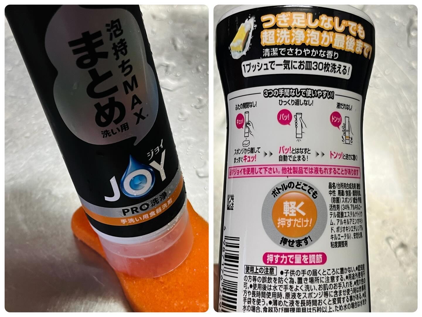 ジョイPRO洗浄 まとめ洗い用は、最長の泡持ちを実現!泡がもこもこ! 逆さボトルなのでにぎるだけで出てきます! すぐ洗い用(泡切れMAX)は、最速のすすぎを実現!泡切れがよく泡がきれいに無くなる!