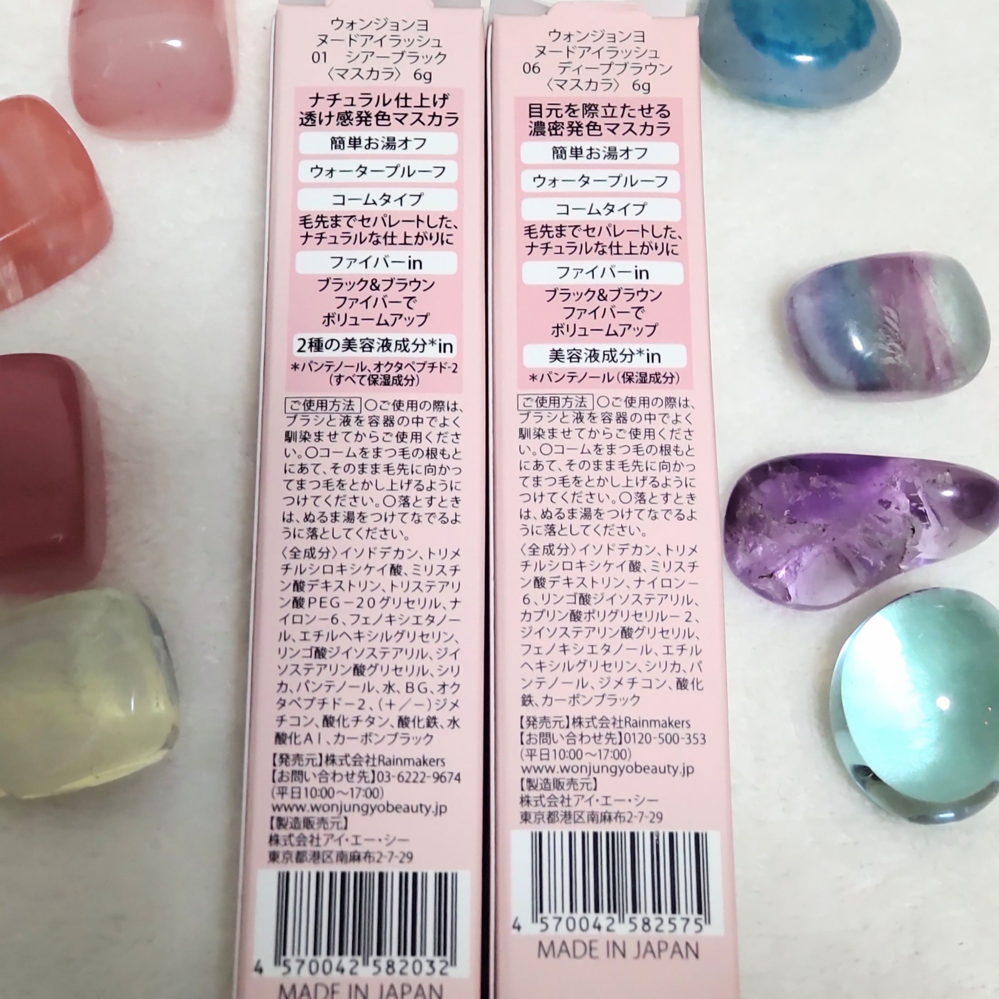 Wonjungyoウォンジョンヨヌードアイラッシュ01シアーブラック05ディープブラック01より05の方が時間が経っても白くなりにくかったです。コームタイプでダマになりにくく、自然にぱっちりなまつ毛を作れるのが良いです!01シアーブラックは自...