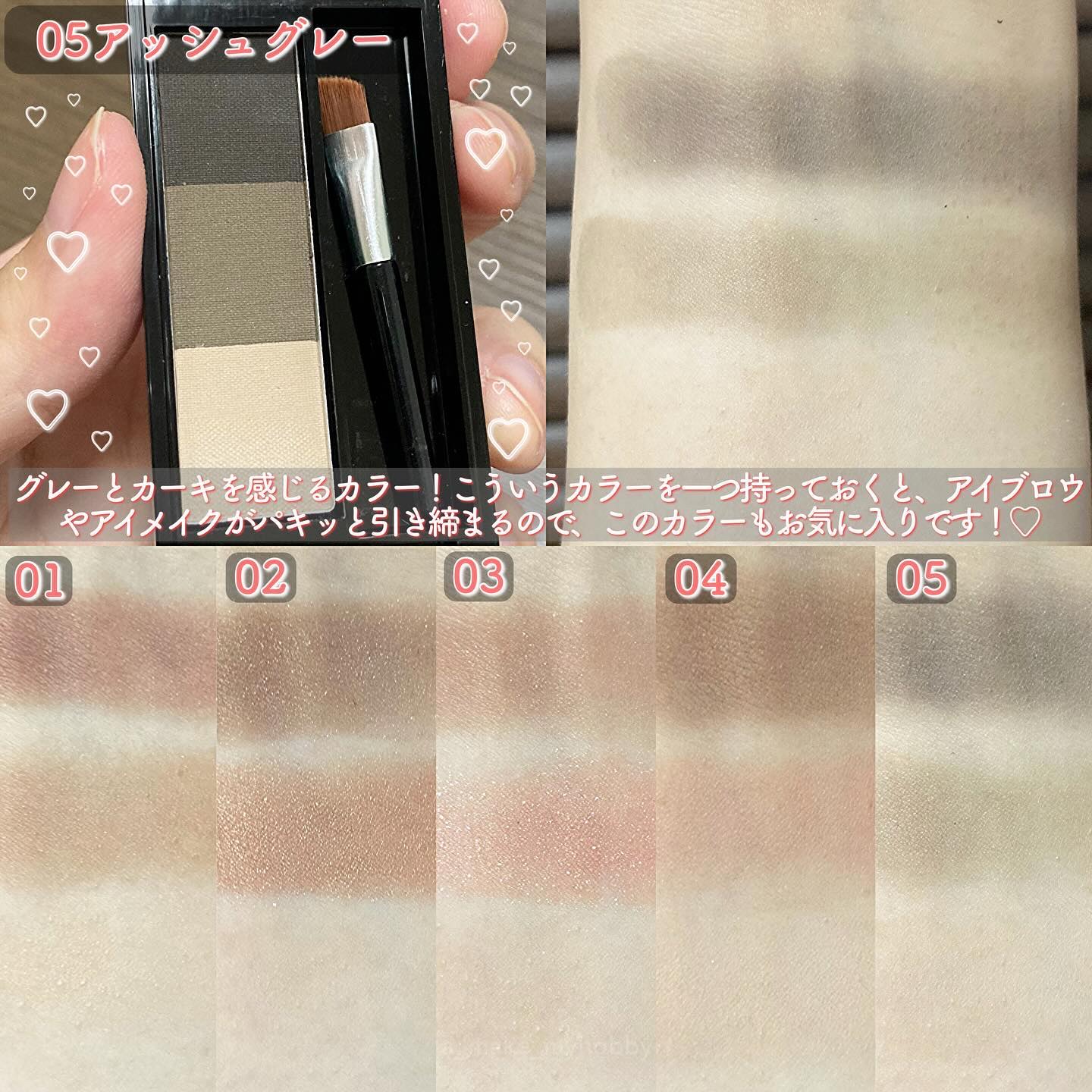 ミラー、ブラシ付きのアイブロウパウダーで全5種類。絶妙カラーの3色パウダーで立体的な眉に仕上がるよ。 全種に1色ずつラメ入りカラーが入っているのでイマドキのラメ入り眉を作るのに便利で、ごく普通のナチュラルな眉を作りたい時は上2色で濃淡調整したらなんとかなります。 どれもラメカラーめっちゃ可愛いなぁ。 アイシャドウかと思ったよ…🤣