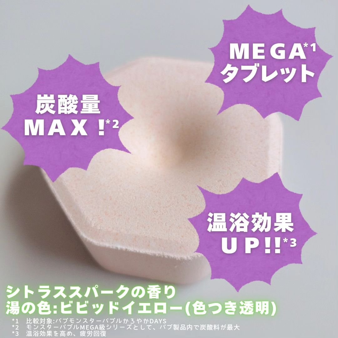 - 【医薬部外品】 この発散*1入浴、きっとクセになる。 今だけは自分にわがままに、思いっきりオフロを楽しもう! シュワっとはじけるスプラッシュ泡。 ●MEGAタブレット*2 ●炭酸量MAX*3 ●温浴効果を高め、疲労回復 ●シトラススパークの香り *1炭酸泡がはじけること *2比較対象:当社バブモンスターバブルかろやかDAYS *3モンスターバブルMEGA級シリーズとして、バブ製品内で炭酸量が最大 湯の色:ビビッドイエロー(色つき透明) シトラススパークの香り