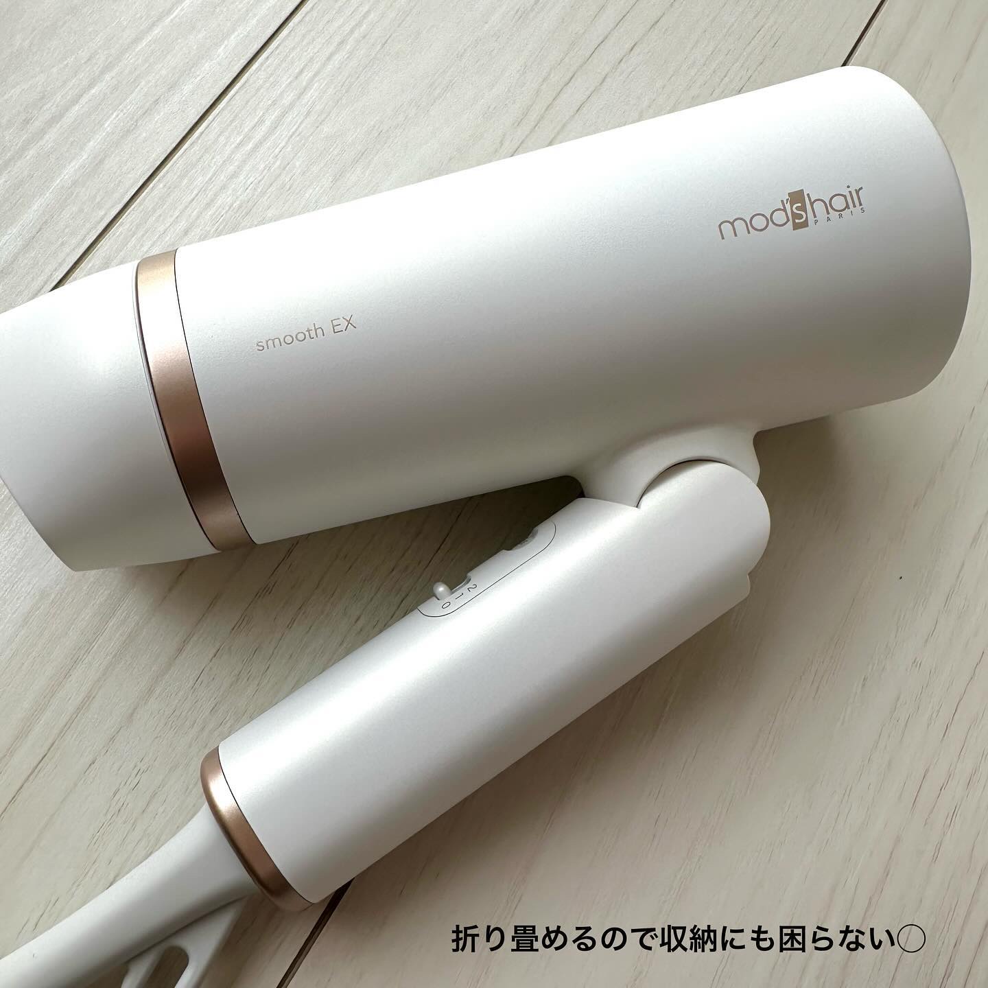 - スムーズEXフィルターで、 上質でなめらかな触り心地。髪の美しさを整える「モッズ・ヘアドライヤー スムーズEX」 せっかく染めてもなかなかキープできないヘアカラー。 髪の水分バランスを整えるマイナス電子、オーバードライを防ぐ低温ドライの効果で、お気に入りの髪色をキープしやすく。 【もっとツヤめく髪へ】 サロン帰りのようなツヤが簡単に。 短めの低温風(約58℃)と長めの冷風が交互に自動で切り替わるサロンモード(温冷自動切替モード)で髪の表面のキューティクルを整え、ツヤのある指通りのいい髪へ。 【その他の便利な機能】 ・選べる5つのモード 5つのモードを搭載、髪への負担を少なく乾かしたい、素早く乾かしたい、仕上げをよくしたい、地肌もケアしたい、5つのモードで選べる使い方が可能に。(スムーズ/サロン/ホット/ケア/クール) ・電源スイッチ 0: OFF / 1: 弱風 / 2: 強風 ・クールスイッチ 直感的に使えて、使いやすい ・お手入れ簡単フィルター お手入れしやすいメッシュフィルター採用 ・丈夫なゴムコード ・折りたたみ・軽量モデル 折りたたみモデルだから、収納も簡単