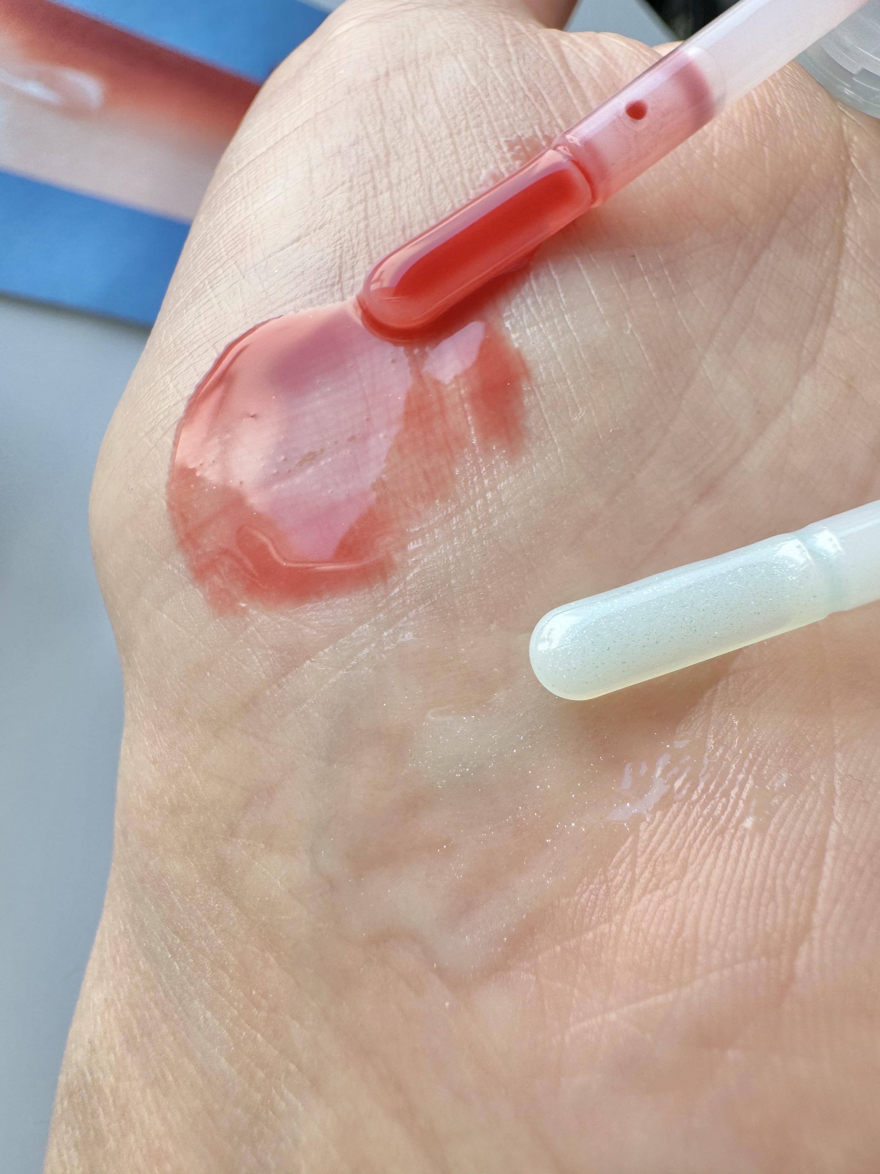 むにゅむにゅがたまらない🤤♡ パウダーチーク1位🥇 コスパ最高すぎ‼︎ ハイライト・チーク・アイシャドウなどマルチに使える “生ぷにっ” 質感フェイスカラー。 馴染みのいいデイリーベージュのハイライトと ベージュを1滴足したアプリコットの血色カラーの組み合わせ。