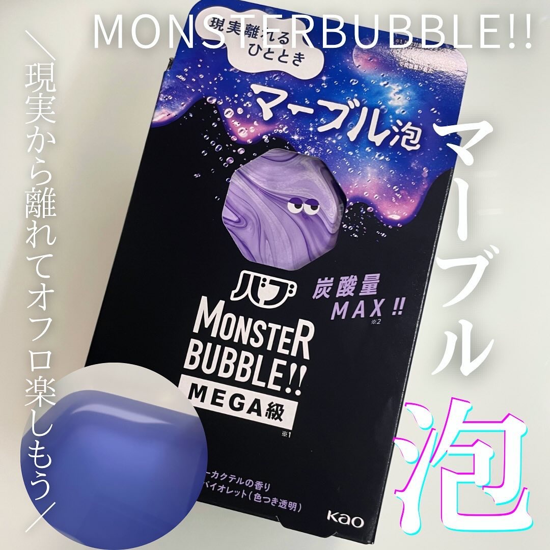 - 【医薬部外品】 この発散*1入浴、きっとクセになる。 外の現実から離れて、どっぷりオフロを楽しもう! とろけてゆらめくマーブル泡。 ●MEGAタブレット*2 ●炭酸量MAX*3 ●温浴効果を高め、疲労回復 ●ラベンダーカクテルの香り *1炭酸泡がはじけること *2比較対象:当社バブモンスターバブルかろやかDAYS *3モンスターバブルMEGA級シリーズとして、バブ製品内で炭酸量が最大 湯の色:スペースバイオレット(色つき透明) ラベンダーカクテルの香り
