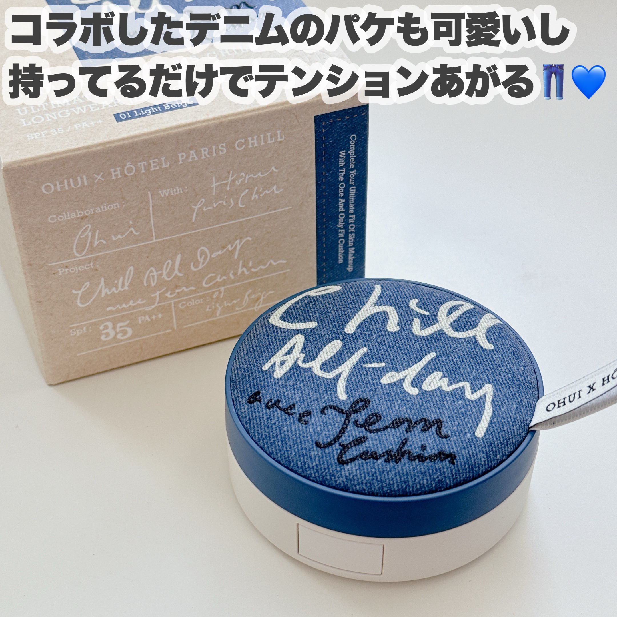 【デニムクッション👖可愛い見た目だけじゃない!】OHUIアルティメットフィットロングウェアデニムクッション01ライトベージュ¥5,490カバー力が全くない訳ではないんだけど薄づきな使用感で厚塗り感が出にくいの!水々しいテクスチャーで肌にピタッ...
