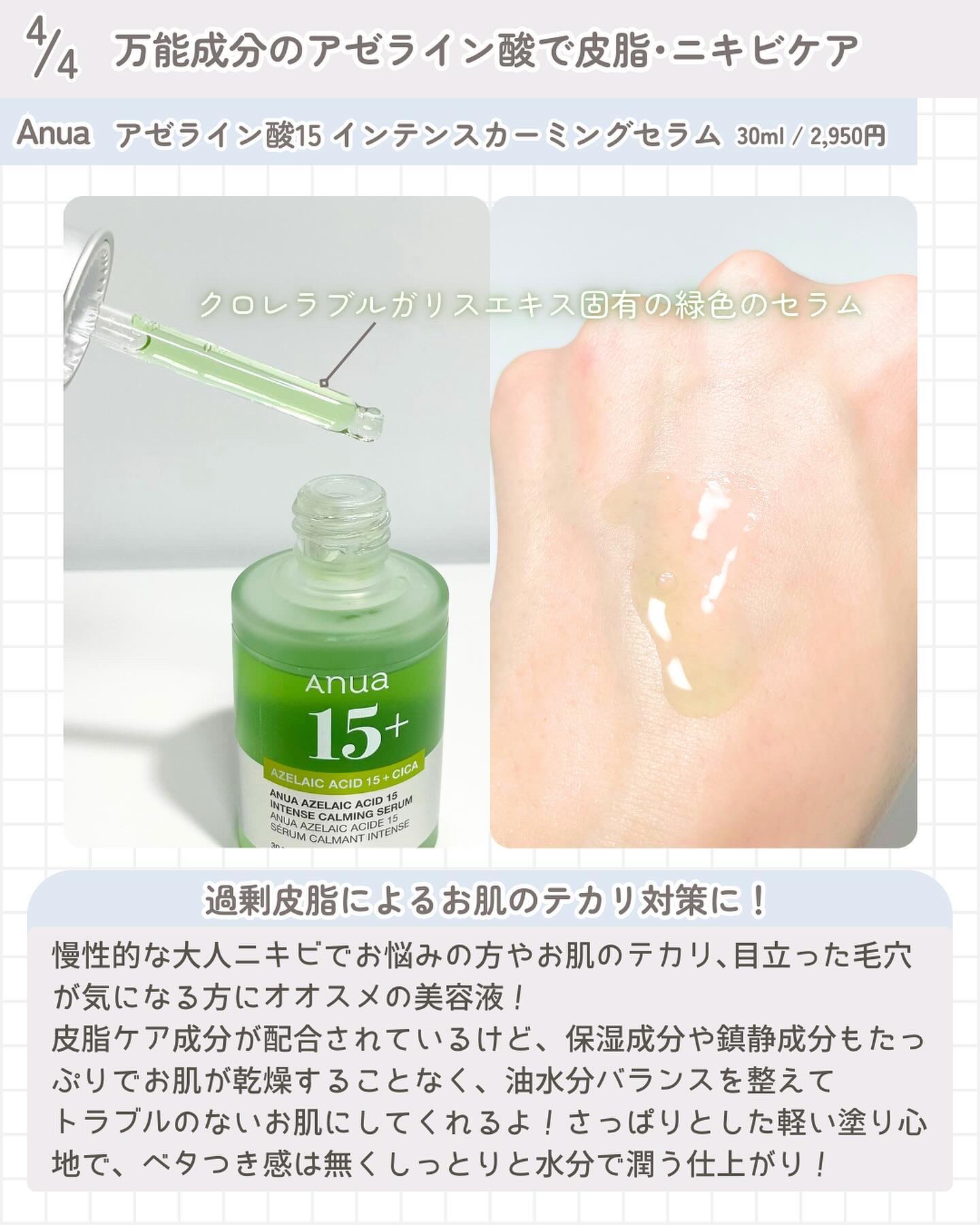 アゼライン酸15 インテンスカーミングセラムは、万能成分とも言えるほど様々な効能があるそう。ニキビや肌トラブルなどの炎症の緩和、過剰皮脂の抑制、角質ケア、毛穴の縮小、シミ・そばかす、ニキビ跡などの美白ケア等。 テカリが気になるオイリー肌の方にも役立つ。過剰な皮脂を抑えてくれるので、べたつく夏の肌にもピッタリ! 鮮やかなグリーンがキレイ💚 さらりとした軽いテクスチャーで、肌にサッとなじんで、夏でもさっぱりと使える。