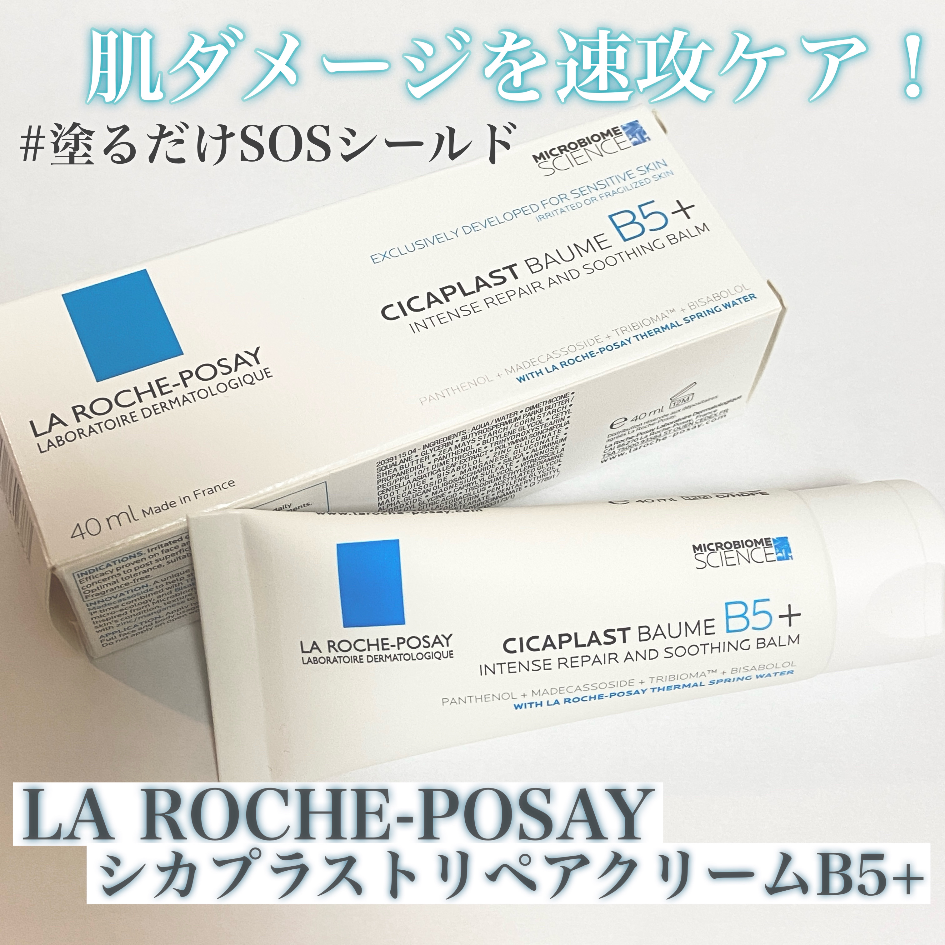 - 塗るだけSOSシールド うるおいの先、肌荒れ予防やダメージケア*1まで。 ①7種の肌悩み*2に。肌ダメージ*1を速攻ケア*3 ②独自のダーマCICAテクノロジー*4採用。 CICA成分*5、パンテノールB5*6、独自成分トリバイオーマ*7配合。 ③長時間*8見えない刺激*1から守るセカンドスキンシールド*9 *1 乾燥による *2カサつき、乾燥による肌荒れ防止、乾燥によるくすみ、キメの乱れ、乾燥ガサガサ肌への保湿、美容トリートメント後(肌管理後)、花粉などの飛散物汚れからの肌保護 *3 お手入れにより *4 ツボクサ葉エキス、α-グルカンオリゴサッカリド、ポリム二アソンチホリア根汁、乳酸桿菌、マンノース(全て整肌成分)、パンテノール(保湿・整肌成分) *5 ツボクサ葉エキス(整肌成分) *6 パンテノール(保湿・整肌成分) *7 α-グルカンオリゴサッカリド、ポリム二アソンチホリア根汁、乳酸桿菌、マンノース(全て整肌成分) *8 ラ ロッシュ ポゼ調べ。個人差があります。 *9 化粧膜