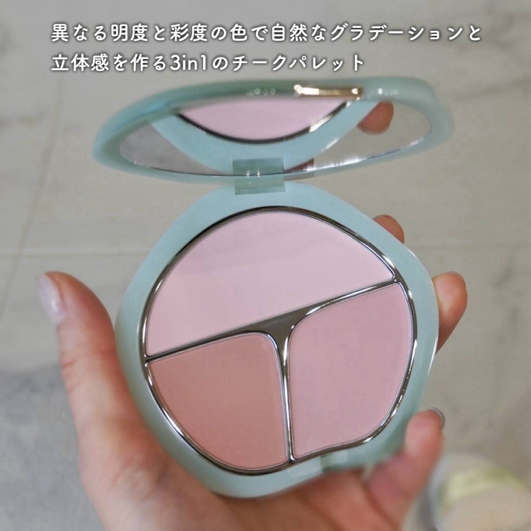 - 「膨張色+メインカラー+収縮色」の三色一体型チークパレット。 異なる明度と彩度の色で自然なグラデーションと立体感を作ることが可能。単色で使用すれば様々な雰囲気のメイクが楽しめ、違う色を重ねて使用すると、三色が程よいバランスで雰囲気と立体感を作り出す。