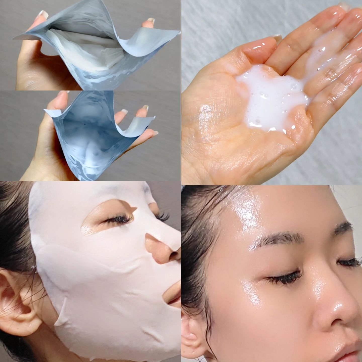 こちらのシートマスクは洗顔後、化粧水の代わりに使うタイプです💡 トロミのある美容液がたっぷり✨✨ シートが、メルティーフィールシートでとろけるような柔らかい素材で伸縮性もあって、フェイスや目周りにフィットしやすい印象でした👍 肌あれ防止効果、油分と水分バランスを整える効果のある、アゼライン酸誘導体が配合されているので、肌トラブルや皮脂バランスが気になる方にもオススメです👍