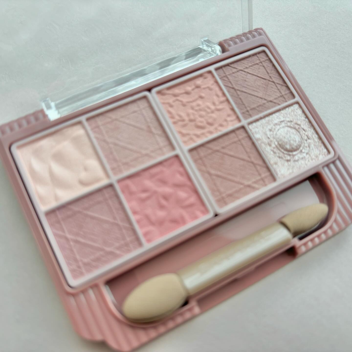 - いつでも一緒♡多色なのに持ち歩ける! 8色入りアイシャドウパレットのマットタイプ♪ 多色パレットでありながら、「持ち歩けること」と「外出先でもメイク直しができること」にこだわったアイシャドウパレット。 ダブルエンドチップ付です♪ マットが大好きな方にも、少し苦手意識がある方にも手に取っていただきたく全色マットor1色ラメ入りの構成にしています♪ (M01:全色マット、M02・M03:1色ラメ入り) 全体は同系色で統一しており、全色使いやすいパレット。 色の組み合わせは自由に♡自分好みのメイクを楽しめます! 【マット】 隠ぺい感とふわっと感を両立させた質感♪ なめらかで重ねても粉っぽくなりにくく、厚塗り感のない仕上がり。 伸びが良いのでムラになりにくく、しっとりフィットして仕上がりを長時間キープ✨ 【ラメ】 ラメ・パールだけがのる透明感のある仕上がり。 高輝度なガラスパール配合で、高見えする輝き✨ なめらかで粉っぽくならず、しっとり密着して仕上がりを長時間キープ! サラサラしたマットシャドウにもラメがしっかり密着する処方を追求しました♪ 蓋にはマット感を表現したすりガラス風のグラデーションデザインが、パウダー部分にはリボンやレース・ボタンの型押しが入っているなど、デザインにもこだわっています♡