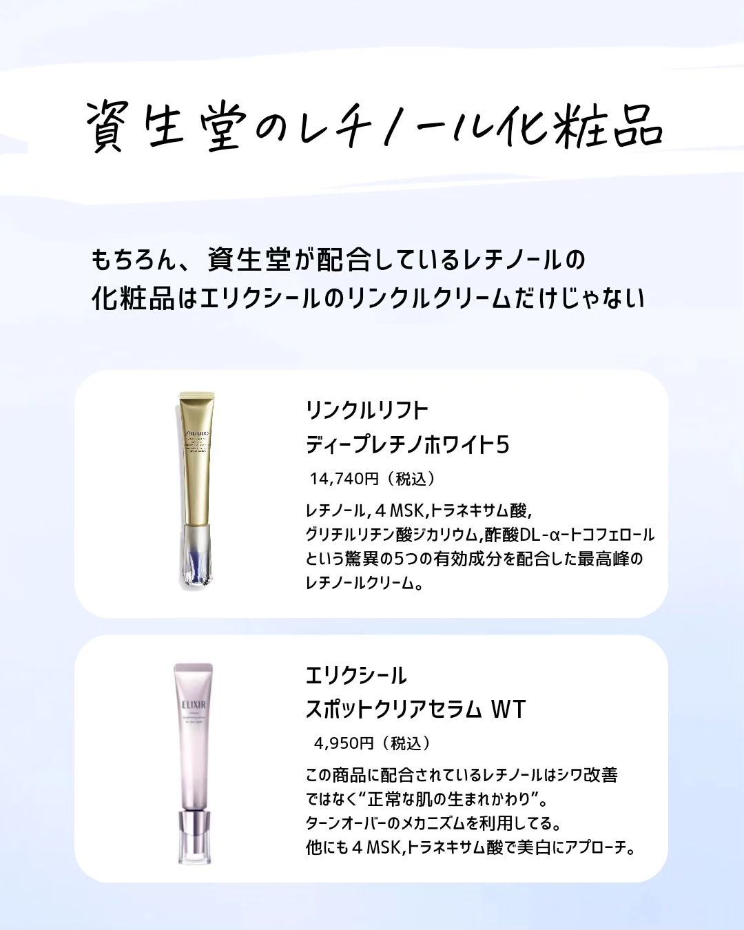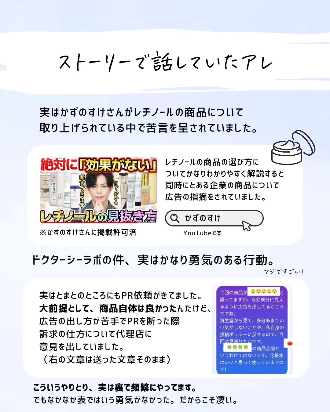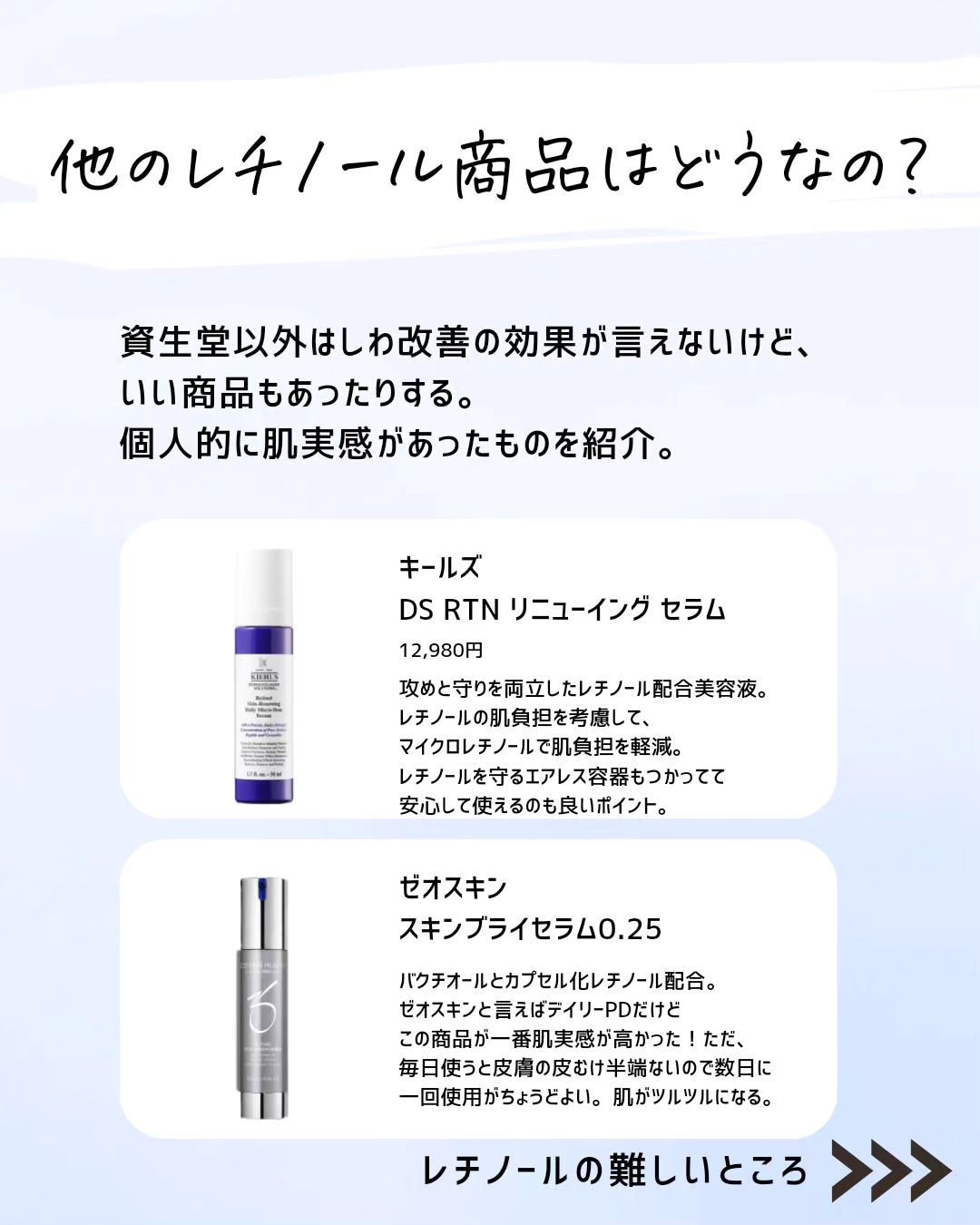 今日ちょうど、かずのすけさんのレチノールの動画を見たところでした。とても納得させられました。