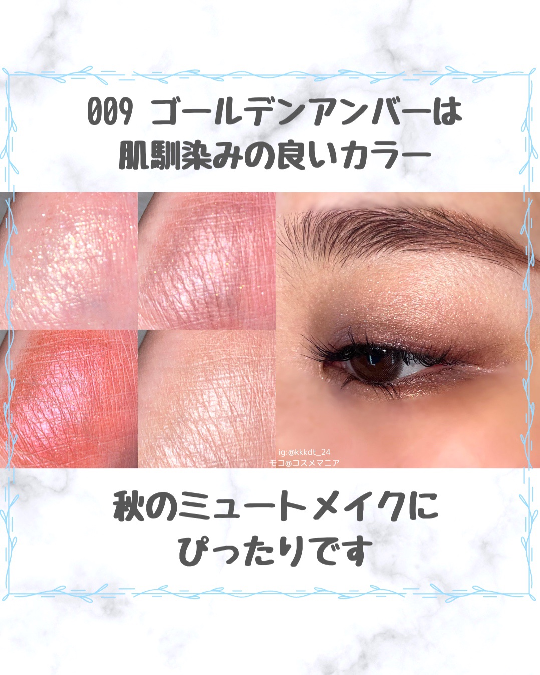 - 透け感カラーに、キラめきレイヤードをプラス #質感ミックス アイシャドウ 1. 4つの異なる質感をミックス マット・サテン・パール・グリッター、4つの質感が楽しめるマルチパレット 2.透け感そのまま!キラめきのレイヤード 重ねても、キレイにキラめく透け感カラーで、澄んだ奥行きのある目元に 3.ふわっとエアリー、なのに高密着 キメの細かな微粒子パウダーがふわっとフィット。軽いのに、しっかり密着 ■001 グレイジング ブラウン 肌にとけ込むシックなグラデ ニュアンス ベージュ ■002 サンセット ブリック マットとキラメキで旬顔! スモーキー テラコッタ ■003 ヴィンテージ ローズ 甘さおさえめでオトナっぽい ボルドー ピンク ■004 ロージー ブラウン 上品に盛れる! ローズ ブラウン ■005 ダスティ モーヴ 繊細なニュアンスを秘めた グレージュモーブ ■006 サファリ シマー 印象深いまなざしの カーキグリーン ■007 ジュエル ムーン ほんのり甘めのキラめき プラムピンク ■008 カシミア ヌード 上質なカシミアを纏ったような ウォームベージュ ■013 ローズ ラスター クールなまなざし グレイッシュローズ ■015 コズミック スター 幻想的な煌めき ブロンズピンク