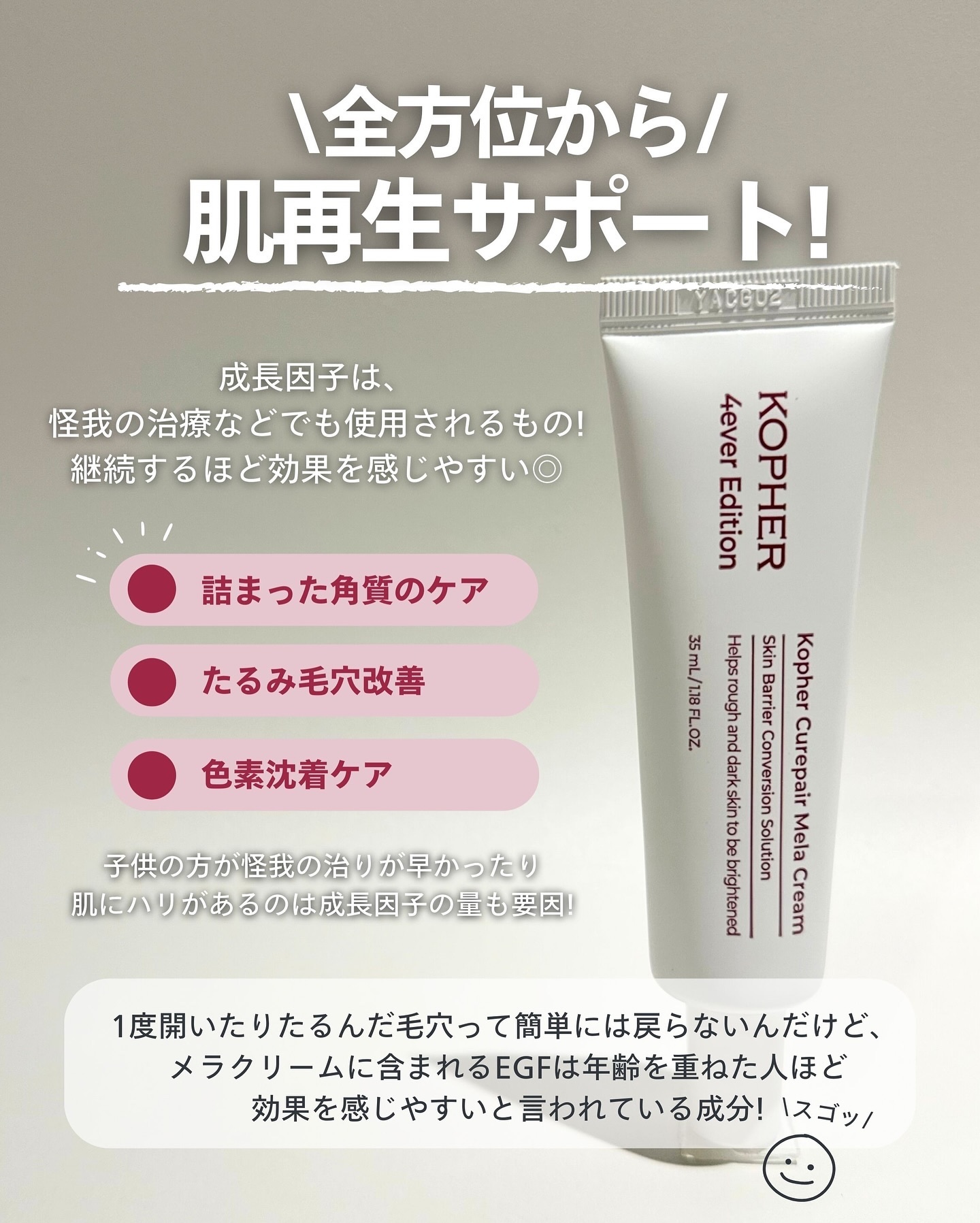 通称【メラクリーム】🤍🤍 成長因子クリームって??主にEGFという成長因子が入っているクリームのことを言います✨ EGFは微量でも60日間塗り続けることで再生因子がドン!と増えることが証明されているんだそうです😳❣️❣️ テクスチャーは少し硬めのクリームで馴染みにくいかな?って思ったけど、馴染ませてるうちにしっかり馴染んでくれてベタつかない👍