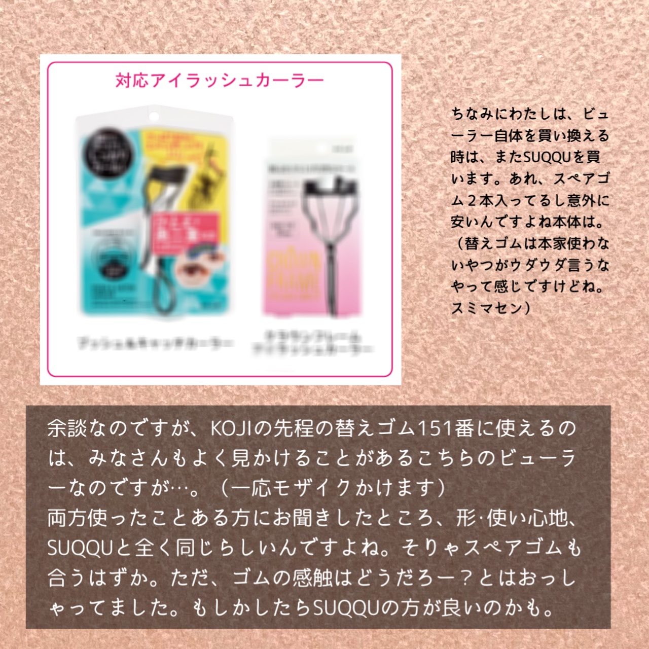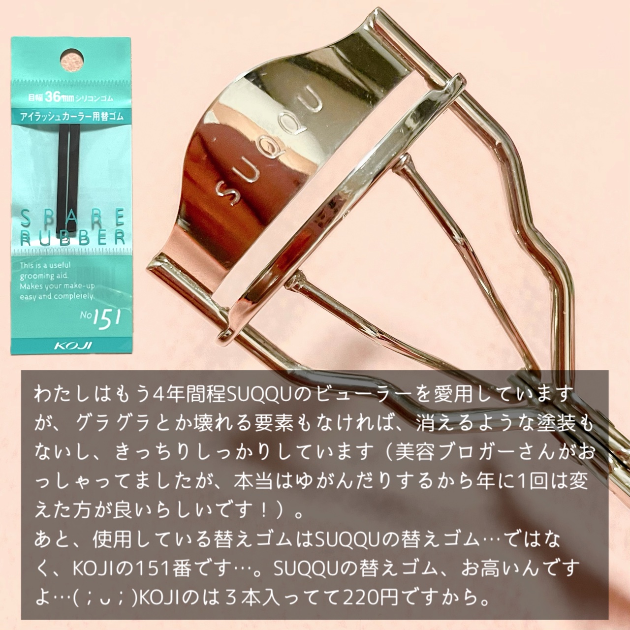 SUQQUの替えゴムはコージーのスペアラバー No.151で代用できます! SUQQUやコージーのゴムは硬めなので、まつ毛が食い込みにくく、抜けにくいです。 重めまぶたでもまつ毛が上がりやすくなるポイント✅ 生え際にぴったりつける✅ 生え際を動かさずに、上のカーブをまぶたに食い込ませる✅ まぶたがめくり上がるのを確認して、まつ毛を挟む✅ 手首ではなく肘を動かして上げる
