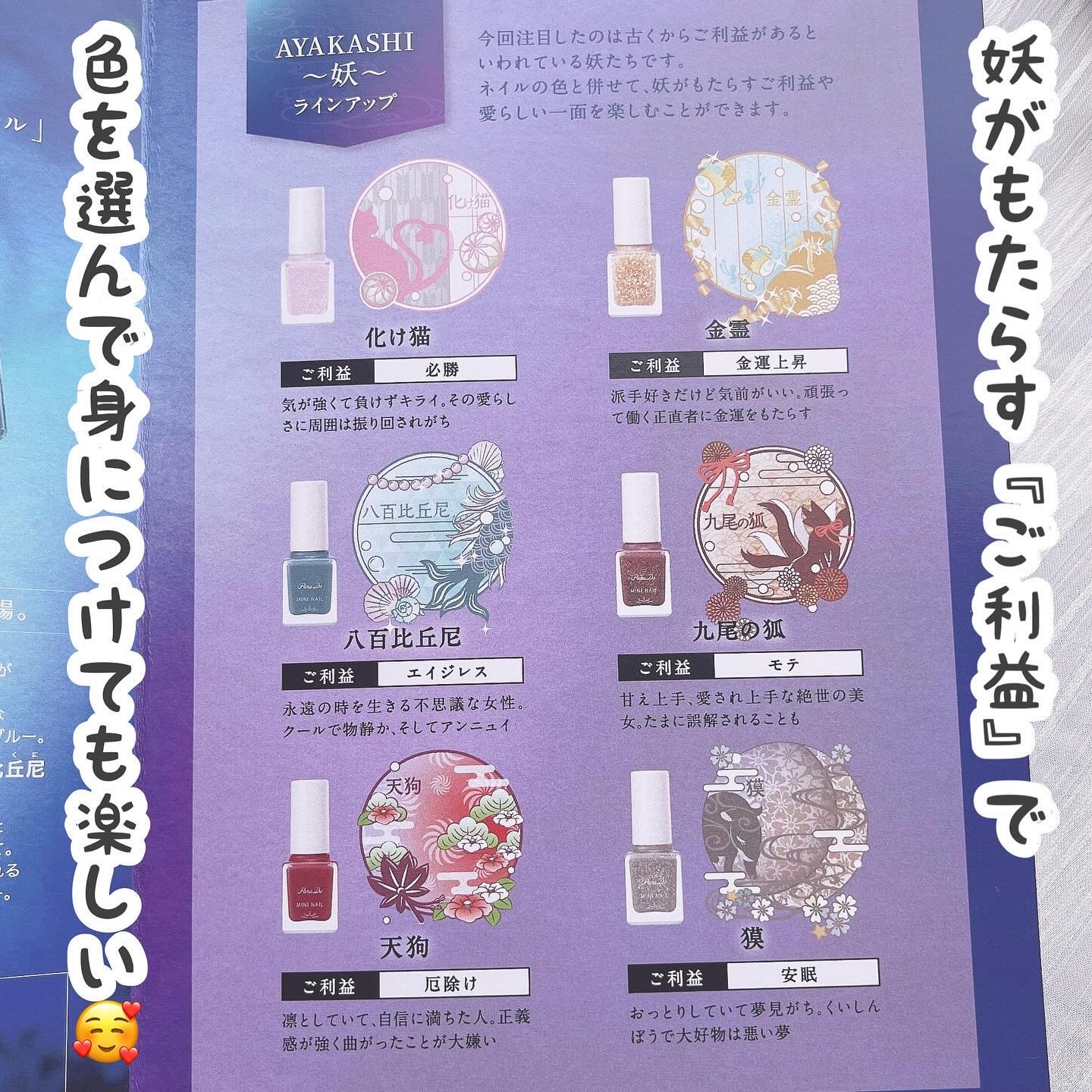 バクに食べられた夢をイメージしたネイルデザインをご紹介します。 金箔風ラメがはちゃめちゃにかわいい〜!これはストック買い必至だと思います! パラドゥミニネイル 2024秋冬新色「 AYAKASHI -妖- 」全6色 4.0ml / 各¥385(税込)