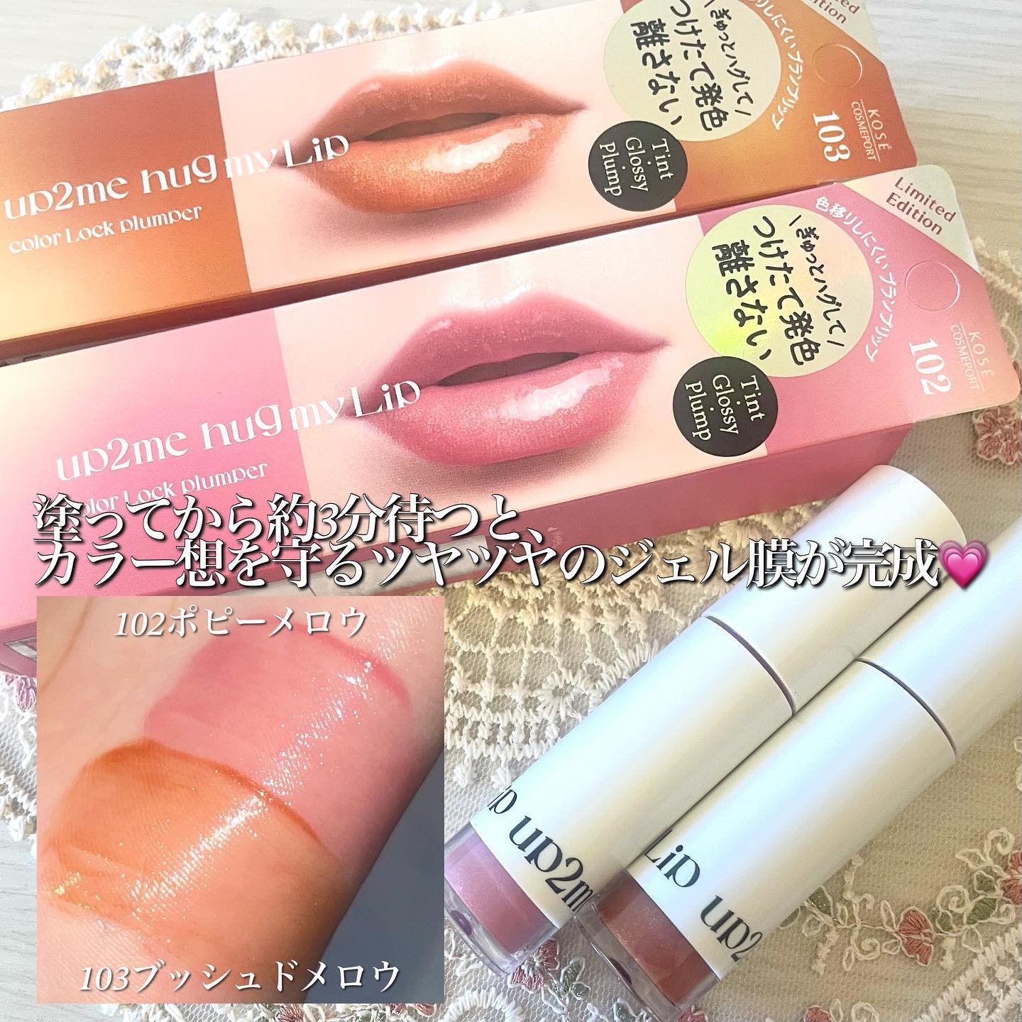 - ぽっと染まった唇、ぎゅっとハグして離さない。つやつやジェル膜がつけたての色を守り、きれい発色つづくプランプ*リップ *メイク効果