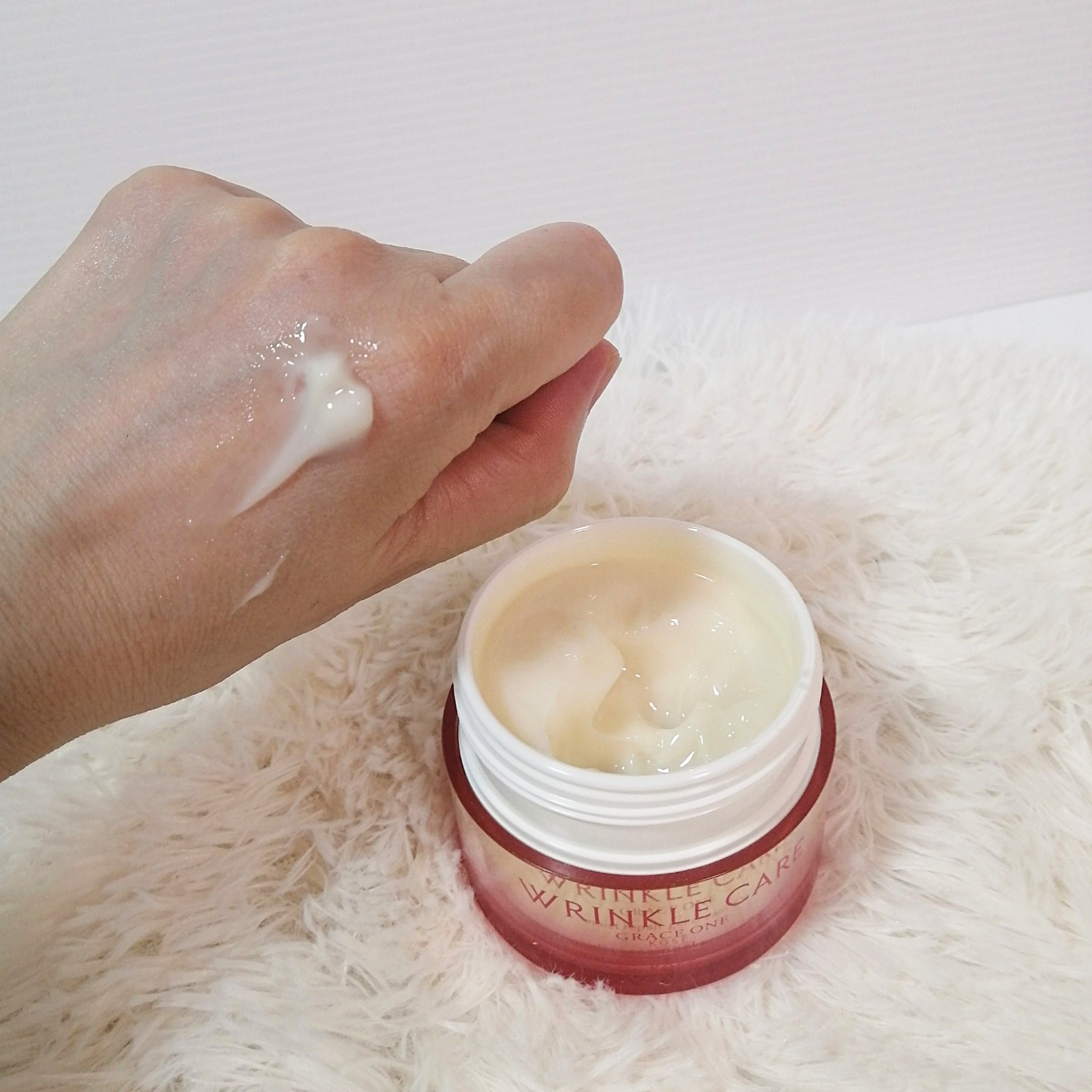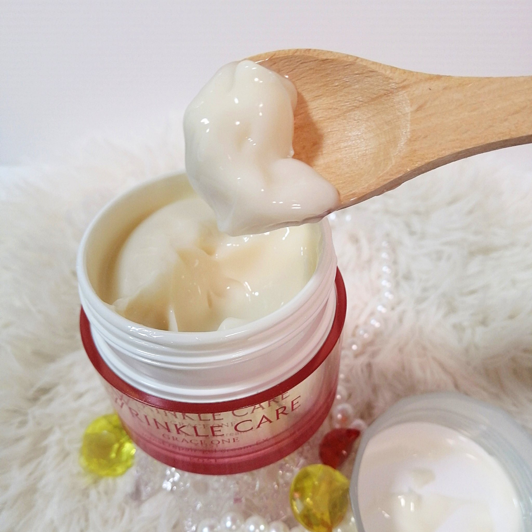 なめらかなジェルクリームでのびが良くベタつかないテクスチャー いつものお手入れにはパール大2~3個、しっかりスペシャルケアならさくらんぼ大1個 フローラル系の香りが優しくて スキンケアの最後にリラックスした気分になれちゃうよ♪ コーセーコスメポート株式会社 様よりご提供いただきましたグレイスワンリンクルリフトジェル