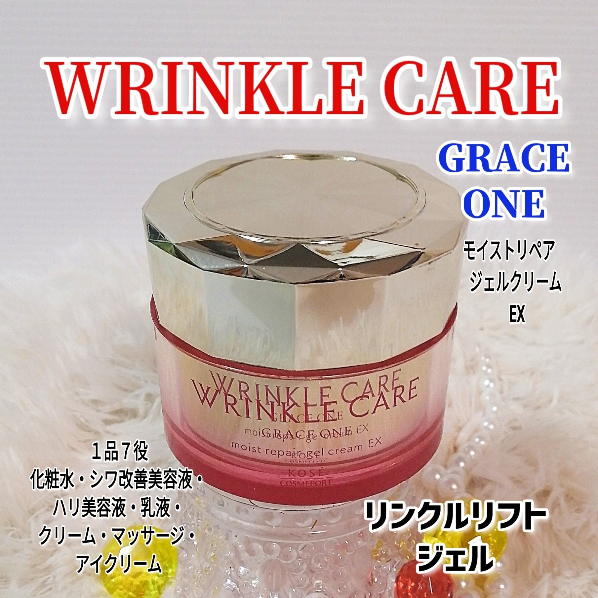- 販売名:グレイス ワン リンクルケア モイストリペア ジェルクリーム EX 1品7役、シワを改善する高機能オールインワンジェル。 W有効成分配合。高機能モイストリフト成分配合。 こくのあるジェルクリームで肌(角層)のうるおい低下を防ぎながらシワ悩みをケアします。