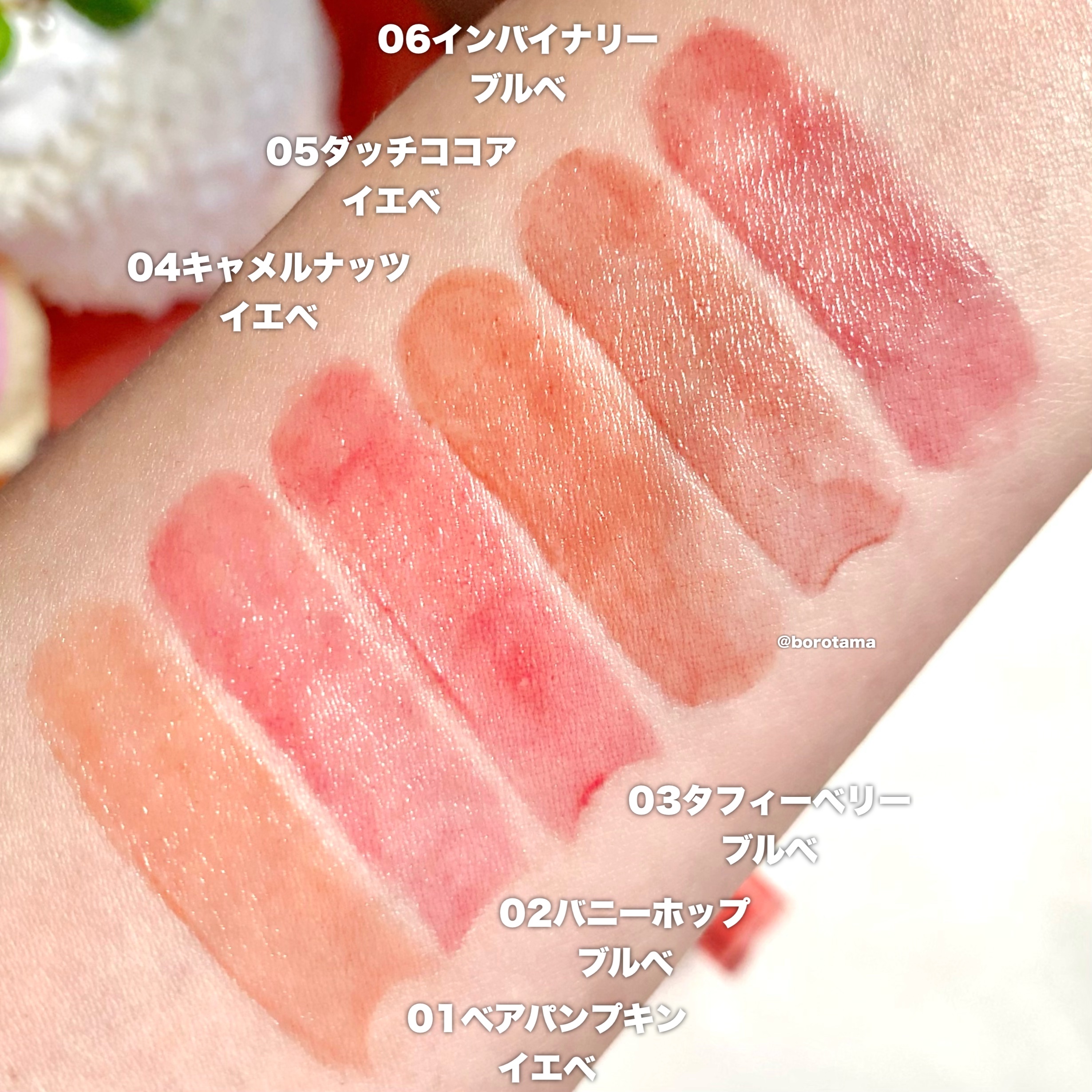 - <01 ベアパンプキン(BARE PUMPKIN)> オクチルドデカノール、ペンタイソステアリン酸ジペンタエリスリチル、ジ安息香酸PG、ヘキサ脂肪酸(C5-9)ジペンタエリスリチルエステルズ、トリ(カプリル酸/カプリン酸)グリセリル、合成ワックス、水添ポリイソブテン、ダイマージリノール酸(フィトステリル/イソステアリル/セチル/ステアリル/ベヘニル)、パラフィン、グリセリン、キャンデリラロウ、フェニルプロピルジメチルシロキシケイ酸、合成フルオロフロゴパイト、水添野菜油、リンゴ酸ジイソステアリル、酸化チタン、イソステアリン酸ソルビタン、ラウリルPEG-9ポリジメチルシロキシエチルジメチコン、アルガニアスピノサ核油、トリ酢酸テトラステアリン酸スクロース、ビニルジメチコン、(セバシン酸/イソパルミチン酸)ジグリセリル、ポリヒドロキシステアリン酸、ジステアルジモニウムヘクトライト、(エチレン/プロピレン)コポリマー、トリイソステアリン酸ポリグリセリル-2、レシチン、マイクロクリスタリンワックス、ポリエチレン、水、パルミチン酸エチルヘキシル、ミリスチン酸イソプロピル、イソステアリン酸、酸化鉄、ステアリン酸ポリグリセリル-10、炭酸プロピレン、ポリリシノレイン酸ポリグリセリル-3、黄5、黄4、1,2-ヘキサンジオール、赤202、ジイソステアリン酸ポリグリセリル-2、赤104(1)、青1、トコフェロール、ハス花エキス、ニンファエアアルバ花エキス、ヤマザクラ花エキス、ハイブリッドローズ花エキス、ソルビン酸K <02 バニーホップ(BUNNY HOP)> オクチルドデカノール、ペンタイソステアリン酸ジペンタエリスリチル、ジ安息香酸PG、ヘキサ脂肪酸(C5-9)ジペンタエリスリチルエステルズ、トリ(カプリル酸/カプリン酸)グリセリル、合成ワックス、水添ポリイソブテン、ダイマージリノール酸(フィトステリル/イソステアリル/セチル/ステアリル/ベヘニル)、パラフィン、グリセリン、リンゴ酸ジイソステアリル、キャンデリラロウ、フェニルプロピルジメチルシロキシケイ酸、合成フルオロフロゴパイト、酸化チタン、水添野菜油、イソステアリン酸ソルビタン、ラウリルPEG-9ポリジメチルシロキシエチルジメチコン、アルガニアスピノサ核油、トリ酢酸テトラステアリン酸スクロース、ビニルジメチコン、(セバシン酸/イソパルミチン酸)ジグリセリル、ポリヒドロキシステアリン酸、ジステアルジモニウムヘクトライト、(エチレン/プロピレン)コポリマー、トリイソステアリン酸ポリグリセリル-2、マイクロクリスタリンワックス、レシチン、ポリエチレン、水、パルミチン酸エチルヘキシル、ミリスチン酸イソプロピル、イソステアリン酸、ステアリン酸ポリグリセリル-10、酸化鉄、炭酸プロピレン、黄4、ポリリシノレイン酸ポリグリセリル-3、赤227、1,2-ヘキサンジオール、赤202、黄5、ジイソステアリン酸ポリグリセリル-2、青1、トコフェロール、ハス花エキス、ニンファエアアルバ花エキス、ヤマザクラ花エキス、ハイブリッドローズ花エキス、ソルビン酸K <03 タフィーベリー(TAFFY BERRY)> オクチルドデカノール、ペンタイソステアリン酸ジペンタエリスリチル、ジ安息香酸PG、ヘキサ脂肪酸(C5-9)ジペンタエリスリチルエステルズ、トリ(カプリル酸/カプリン酸)グリセリル、合成ワックス、水添ポリイソブテン、ダイマージリノール酸(フィトステリル/イソステアリル/セチル/ステアリル/ベヘニル)、パラフィン、グリセリン、キャンデリラロウ、フェニルプロピルジメチルシロキシケイ酸、合成フルオロフロゴパイト、水添野菜油、リンゴ酸ジイソステアリル、酸化チタン、イソステアリン酸ソルビタン、ラウリルPEG-9ポリジメチルシロキシエチルジメチコン、アルガニアスピノサ核油、トリ酢酸テトラステアリン酸スクロース、ビニルジメチコン、(セバシン酸/イソパルミチン酸)ジグリセリル、トリイソステアリン酸ポリグリセリル-2、ポリヒドロキシステアリン酸、ジステアルジモニウムヘクトライト、(エチレン/プロピレン)コポリマー、黄4、マイクロクリスタリンワックス、レシチン、ポリエチレン、水、パルミチン酸エチルヘキシル、ミリスチン酸イソプロピル、イソステアリン酸、ステアリン酸ポリグリセリル-10、酸化鉄、炭酸プロピレン、赤202、赤227、ポリリシノレイン酸ポリグリセリル-3、ジイソステアリン酸ポリグリセリル-2、1,2-ヘキサンジオール、黄5、トコフェロール、ハス花エキス、ニンファエアアルバ花エキス、ヤマザクラ花エキス、ハイブリッドローズ花エキス、ソルビン酸K <04 キャメルナッツ(CAMEL NUTS)> オクチルドデカノール、ペンタイソステアリン酸ジペンタエリスリチル、ジ安息香酸PG、ヘキサ脂肪酸(C5-9)ジペンタエリスリチルエステルズ、トリ(カプリル酸/カプリン酸)グリセリル、合成ワックス、水添ポリイソブテン、ダイマージリノール酸(フィトステリル/イソステアリル/セチル/ステアリル/ベヘニル)、パラフィン、グリセリン、リンゴ酸ジイソステアリル、キャンデリラロウ