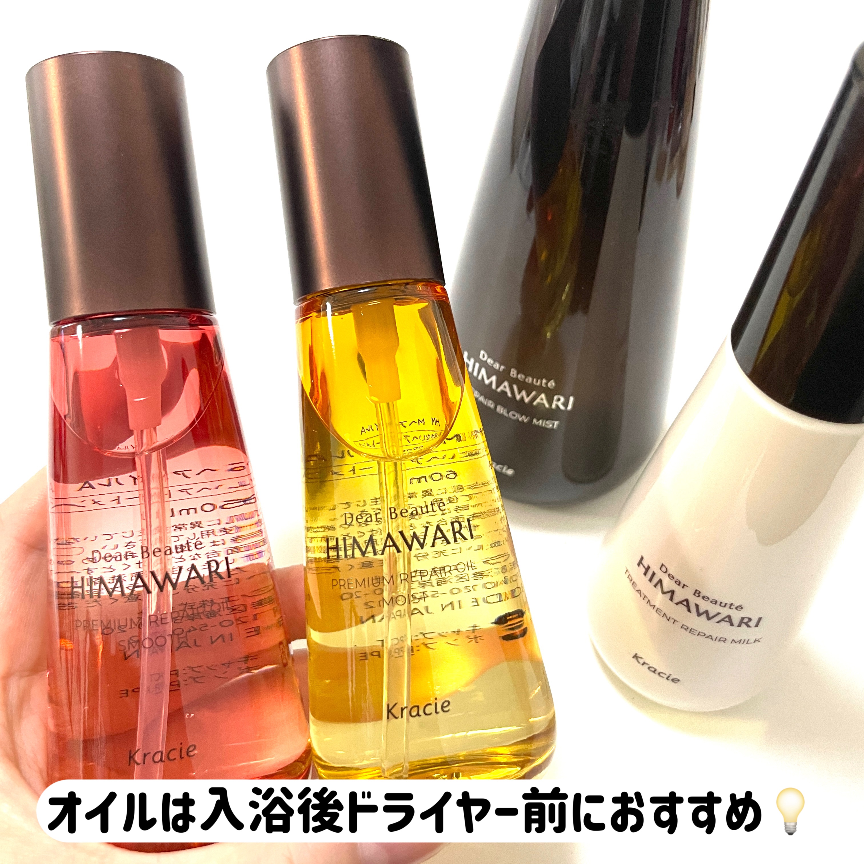 うねりやくせ、パサつきが気になる人におすすめで華やかなフローラルの香りがたまらなく好き💐 ミストやミルク、オイルなどを使い分けて自分の髪に合ったアイテムを選んでみてね🫧 ディアボーテ HIMAWARI*のリペアブローミスト、トリートメントリペアミルク、プレミアムリペアオイル(スムース)、プレミアムリペアオイル(モイスト)