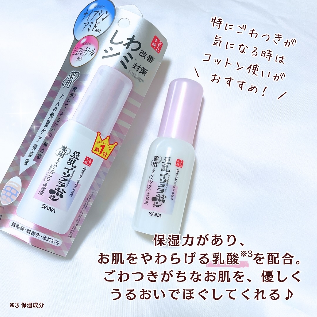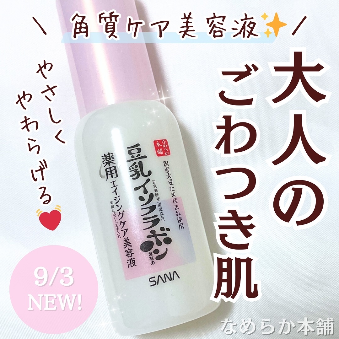 - 【医薬部外品】 浸透*1して、ハリ・弾力感 大人の角質ケア美容液 無香料・無着色・無鉱物油 豆乳発酵液含有の薬用エイジングケア*2美容液 しわ改善&シミ対策できる豆乳の角質ケア美容液 シミ対策:メラニンの生成を抑え、シミ・そばかすを防ぐ 有効成分ナイアシンアミドがお肌の奥まで届く! 角質にアプローチしながら、ハリ・透明感のある素肌へ。 乾燥が気になる大人のお肌に 乳酸(保湿成分):うるおいで角層をやわらかくなめらかに整えます。 豆乳発酵液(保湿成分):弾力感・うるおいを与え、ふっくらとした質感のお肌に。 ピュアレチノール(保湿成分):ビタミンAの一種で、ハリのあるお肌に。 ナイアシンアミド(有効成分):しわを改善し、メラニンの生成を抑え、シミ・そばかすを防ぎます。 ごわつきが気になるときに・・・コットン使い! 洗顔後、化粧水の前にコットンに適量(3プッシュ程度)をとり、お顔全体にやさしくくるくると広げてなじませてください。 つるんとハリ・透明感! 国産丸大豆「たまほまれ」使用 なめらか本舗「エイジングケアライン」オリジナルの豆乳発酵液(保湿成分)は、国内で栽培された大豆「たまほまれ」を丸ごと使用して作られています。 なめらか濃縮製法でつくるオリジナルの豆乳発酵液 豆乳発酵液に使用している大豆は、遺伝子組換えなし大豆を使用しています。 ●パッチテスト済み ●アレルギーテスト済み (すべての方に皮フ刺激やアレルギーが起きないわけではありません。) *1角層まで *2年齢に応じたお手入れ