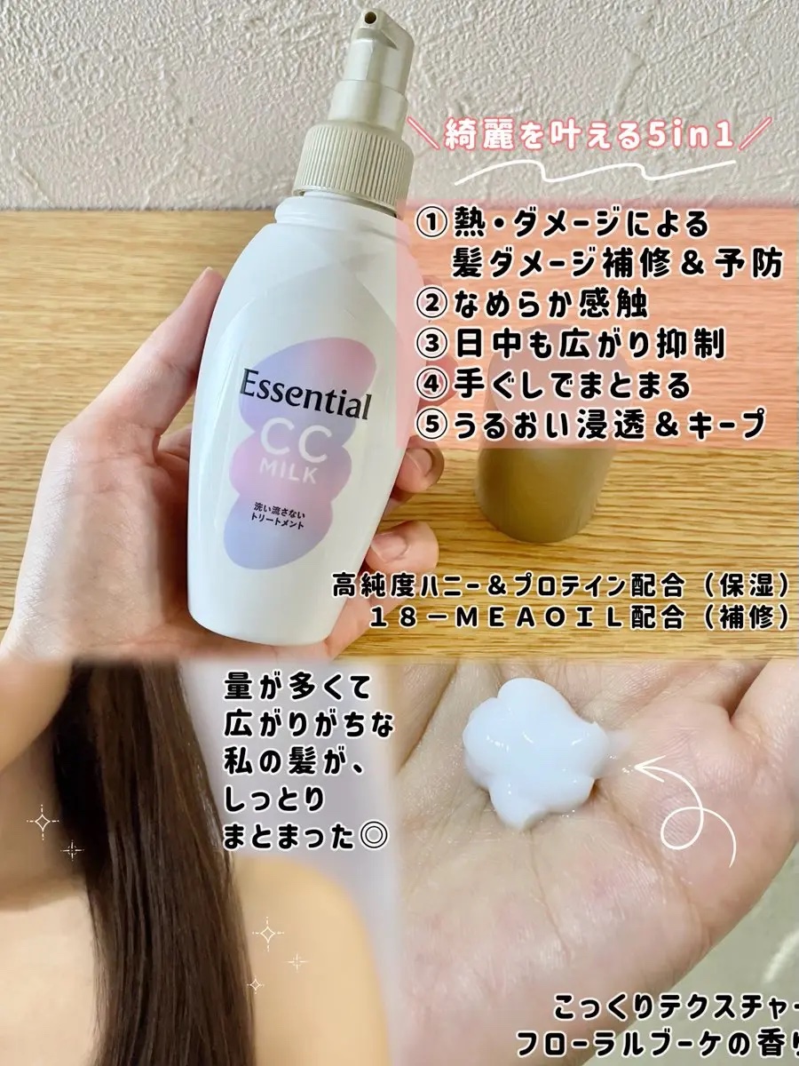 エッセンシャルCCミルク『広がり抑えて、毛先までしっとりまとまる髪へ』キレイを叶える5in1🤍①熱・ダメージによる髪ダメージ補修&予防②うるおい浸透&キープ③毛先までなめらか④日中も広がり抑制⑤手ぐしでまとまる・キューティクル密着補修ケア・内...